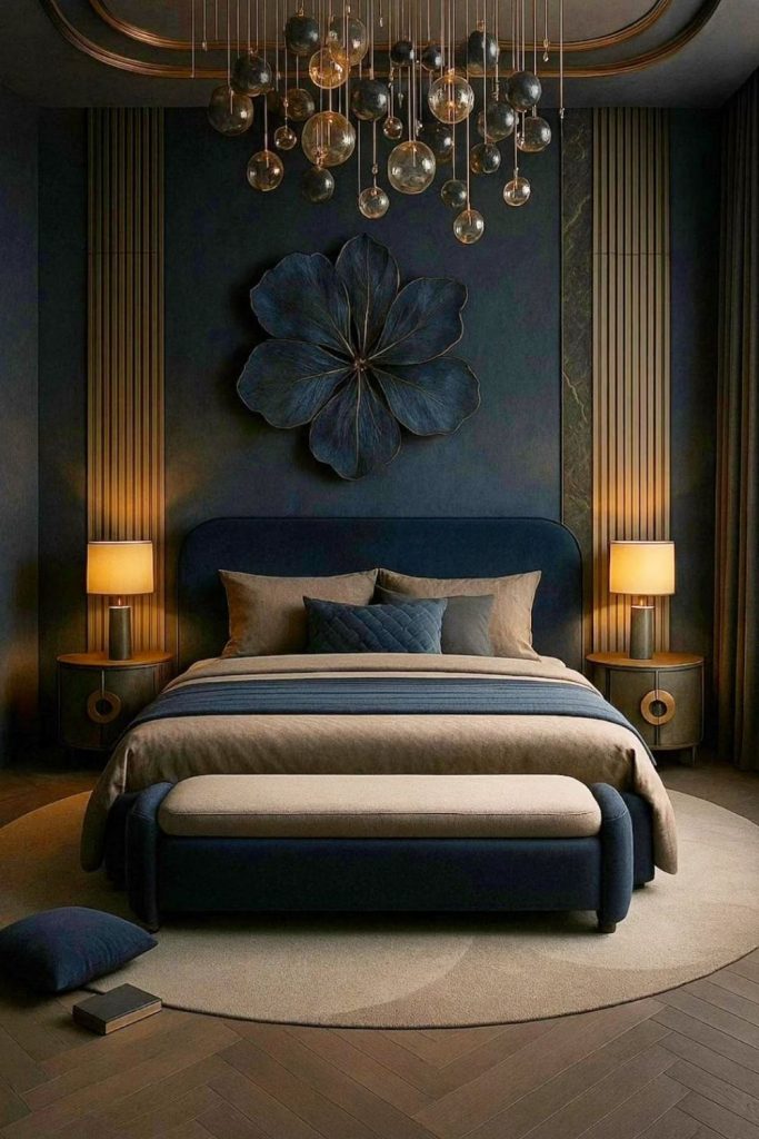 This black bedroom is full of glamour! Glossy black walls shine. Gold pillows and a sleek mirror add luxury. A deep teal velvet throw adds color. A soft rug makes it cozy. Bold but inviting. Perfect for a woman who loves drama. Tip: Add metallic touches. Pin this and share how you bring glam to your bedroom!
