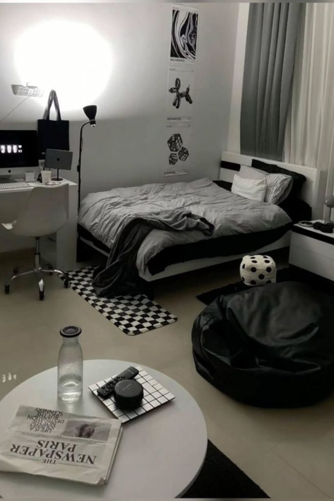 This black bedroom is calm and Scandi-inspired. Matte black walls feel peaceful. A wooden bed and linen sheets add warmth. One abstract picture adds personality. A jute rug is subtle but ties the room together. This look is great for women who want a clean, calm space. Keep decorations simple but meaningful. Want a serene vibe? Try this look! Pin it and share your minimalist tip.