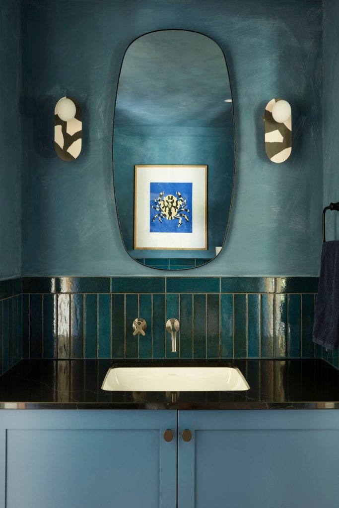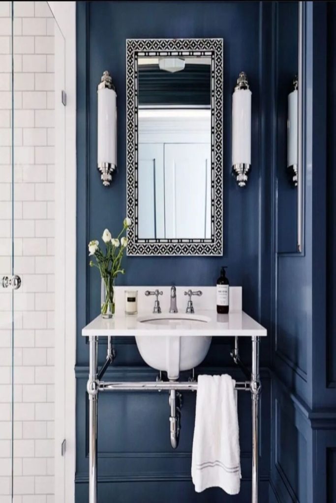 Quick powder room blue accents via art and towels—budget-friendly refresh I love suggesting. Frame ocean prints; swap seasonally. Navy vanity pops against neutrals. Practical: Machine-washable fabrics. This powder room blue accents idea adds personality fast. No tools needed—ideal starter project!