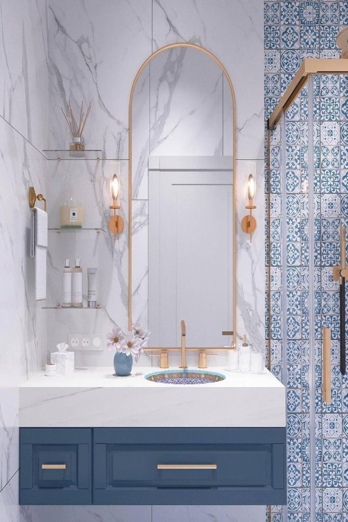 Pattern blue floors in a boho bath? This one is fun. It is free. Like the mix blue boho bath I helped a friend. Mix encaustic tiles. They last. They are trendy. Add rattan mirrors. Add macramé hangs. Green tip: Get old rugs. This gives lived charm. It warms cool tones good. In real, seal floors each year. Fight water spots. Great for fun packed powder room blue bits. Think of rest here. Pure joy.