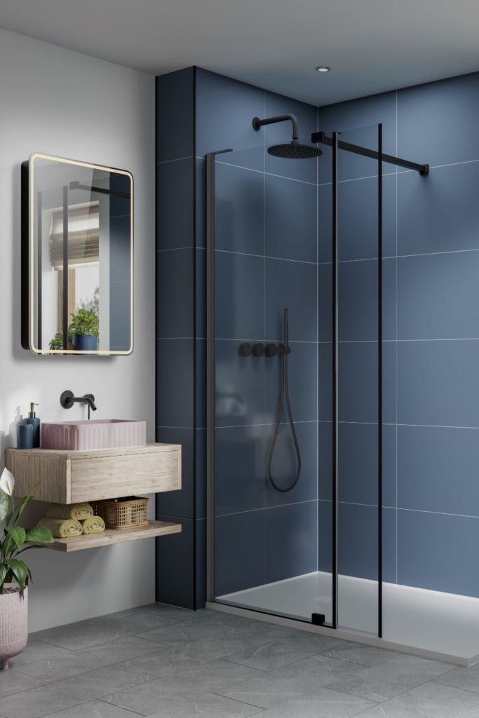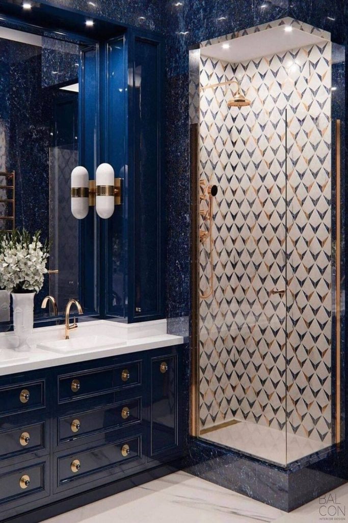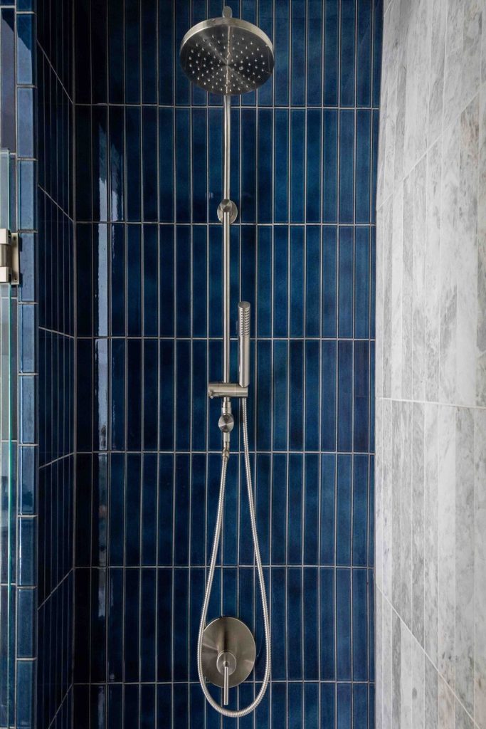Rainfall shower in blue surround—spa luxury at home. Chrome contrasts nicely. Water-saving models eco. Blue shower inspiration daily bliss!