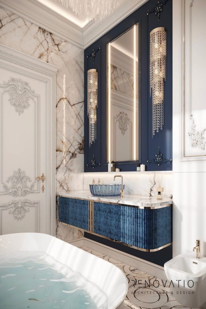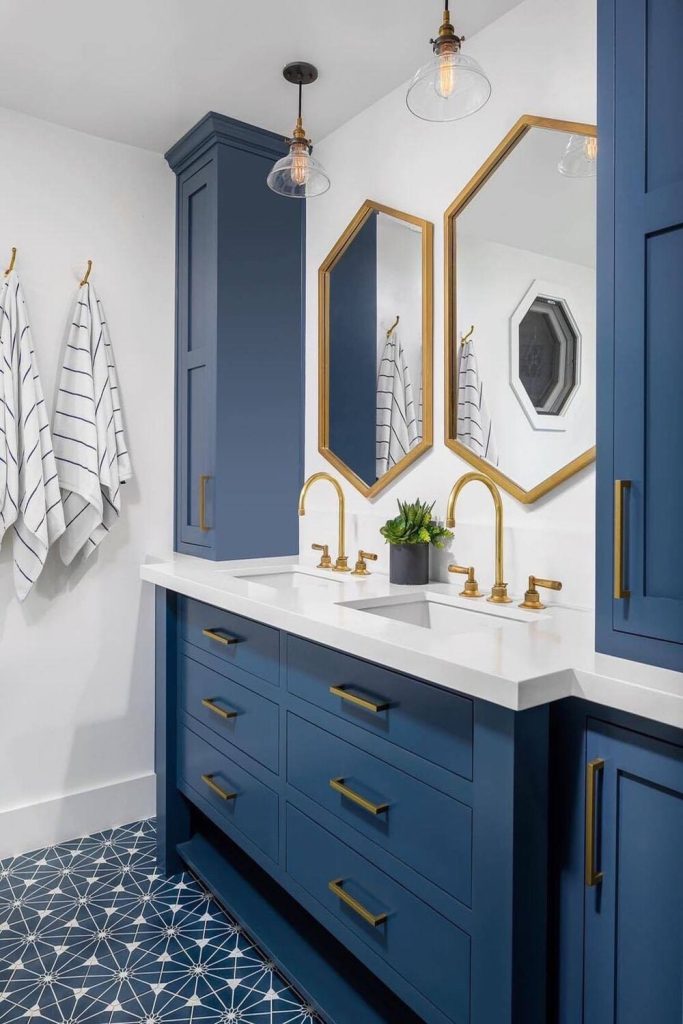 Go into moody blue bath land here. Those navy cabinets next to Carrara marble? Great kiss. From my years fixing luxury blue spa spots, this mix yells class. Pick old glass knobs. Stay green. The under sink hides mess. This is a real win. I told it lots. Add texture towels in light blues. This adds depth. It fits for a rest in busy homes. If navy feels strong, test bits first. Light changes all. Tell if you would go this dark.