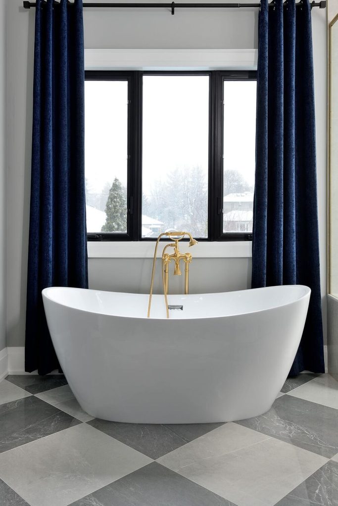 Hexagon blue floors ground the room—mosaic durability from pro jobs. Non-slip glaze safety. Mix sizes for interest. Blue hexagon tiles trend strong. Easy clean with steam.