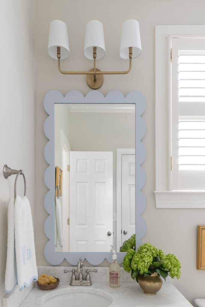 Shell mirrors in coastal blue bathroom—beachcombing finds I incorporate. Natural elements sustainable. Soft blues evoke tides. Relaxing retreat vibe.