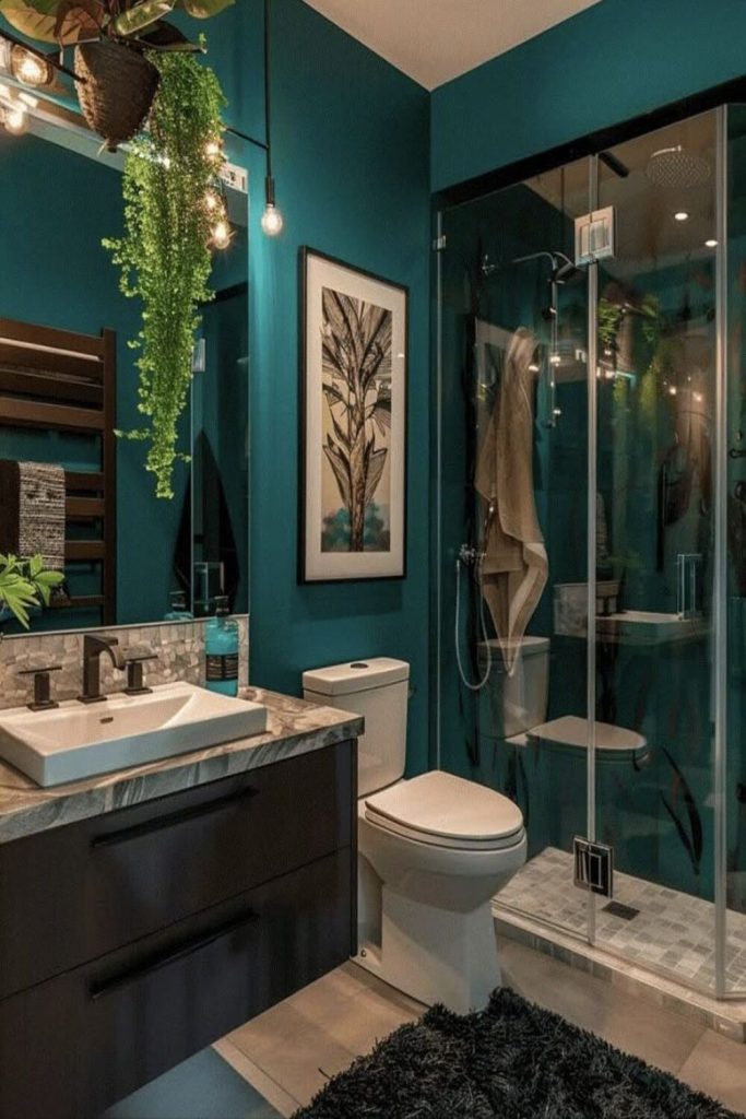 Teal walls with hang plants make calm bath refresh. I added ivy in my own. For that life boost. Matte paint hides bad spots. Go eggshell. Easy to wipe. Bamboo shelves keep it green. This teal bath design gives life to dull spots. Pro reason: Plants clean air. They do it real. For wet, pick pothos. It is cozy. It is now. Save for green thumb goals.
