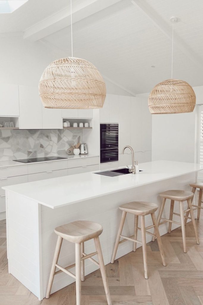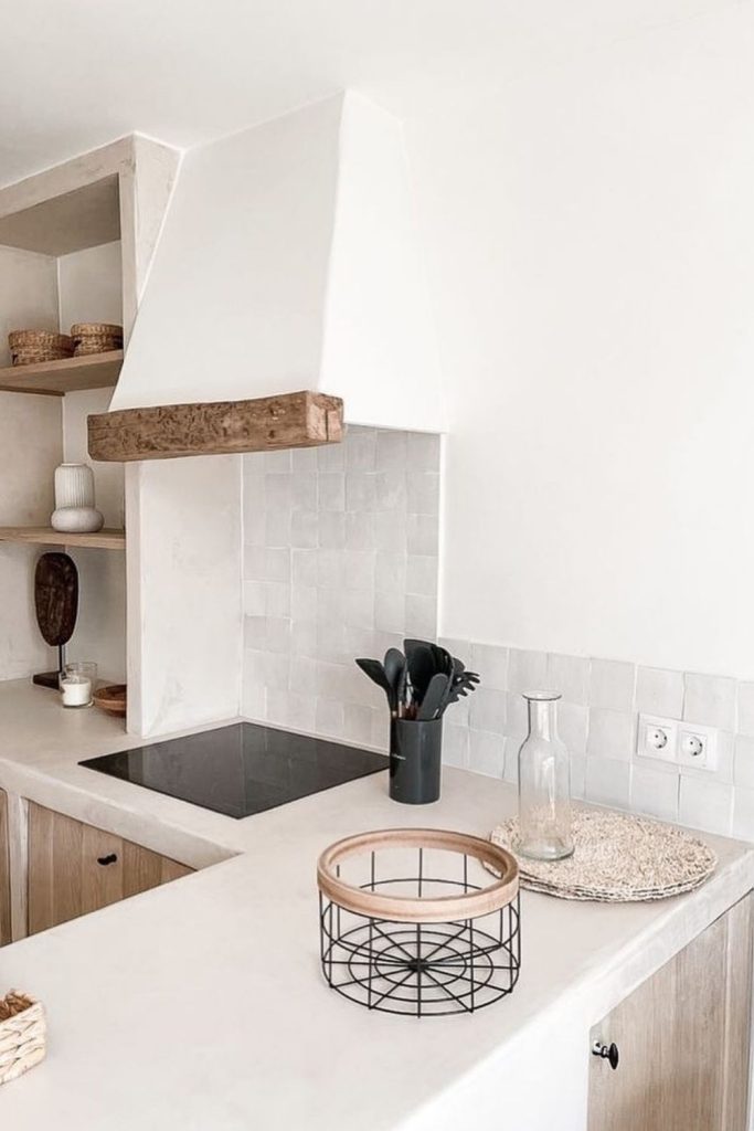 This kitchen is a masterclass in cozy minimalism. Clean white walls and simple wooden shelves keep things airy, while rattan bar stools and a jute rug add boho warmth. A single ceramic vase with dried pampas grass brings an earthy touch without clutter. The soft neutral palette feels timeless, perfect for a serene cooking space. To recreate this, focus on sustainable materials and a less-is-more approach. I love how this kitchen balances simplicity and soul! What’s your favorite way to keep a kitchen feeling light yet inviting? Let me know in the comments!