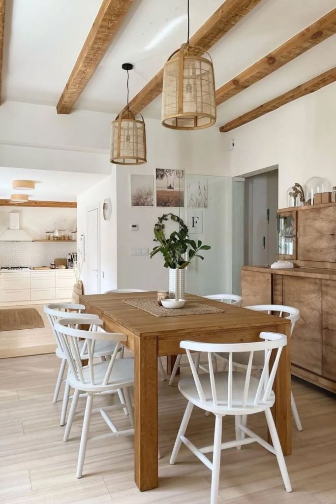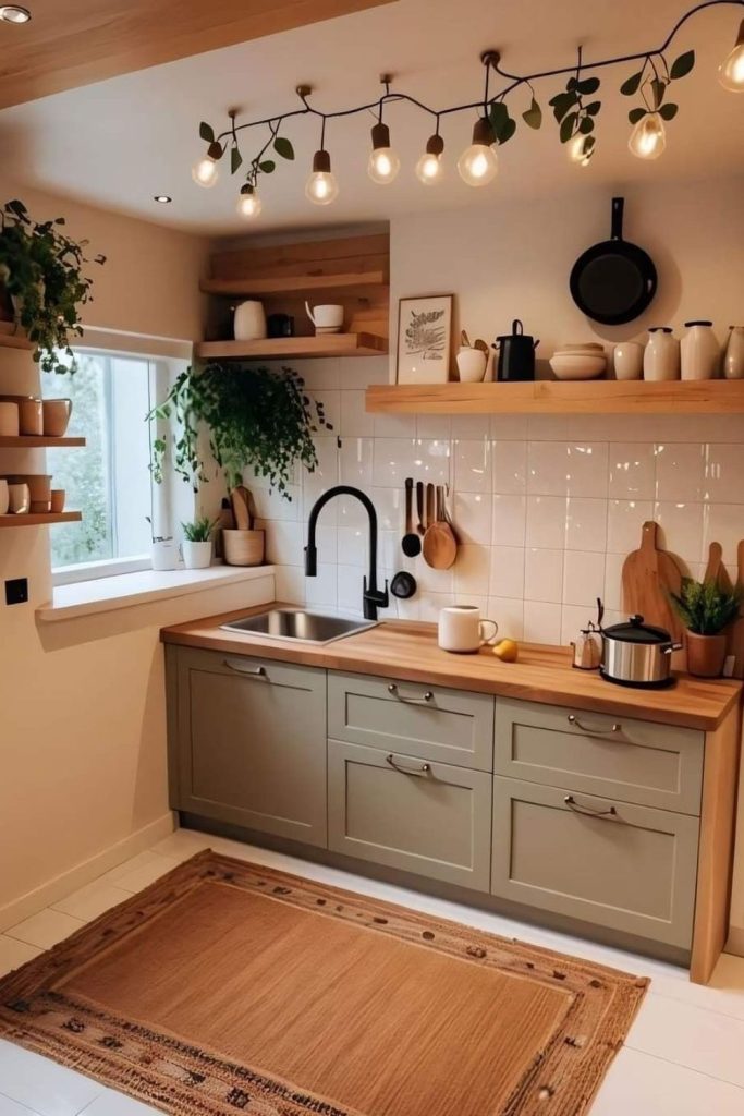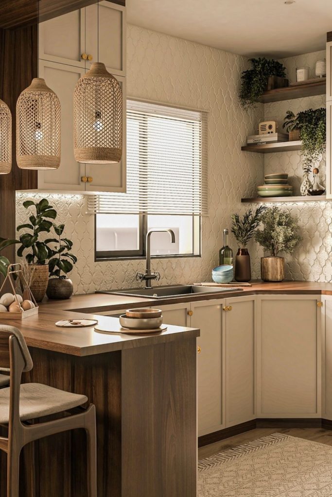 This kitchen blends cozy minimalism with boho flair. Clean white cabinets and wooden countertops create a simple base, while a woven pendant light adds warmth. A single potted plant and earthy ceramics bring just the right amount of texture. The neutral palette—soft creams and warm browns—feels timeless and inviting. It’s perfect for anyone craving a clutter-free yet soulful space. To recreate this, focus on sustainable materials and a pared-down aesthetic. I love how serene this kitchen feels! What’s your trick for keeping things minimal yet cozy? Share it in the comments!