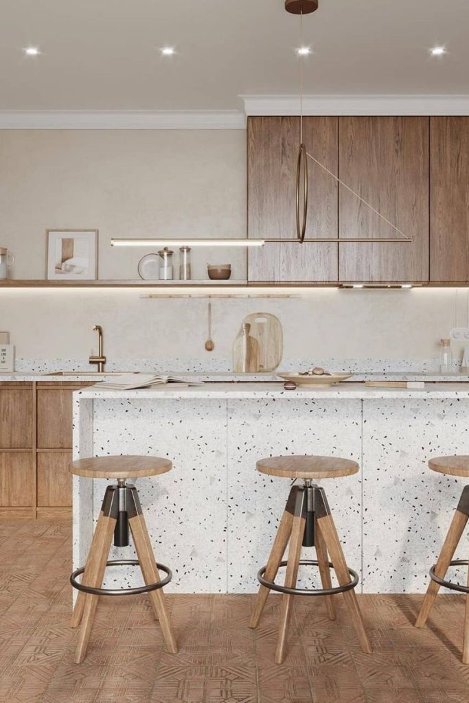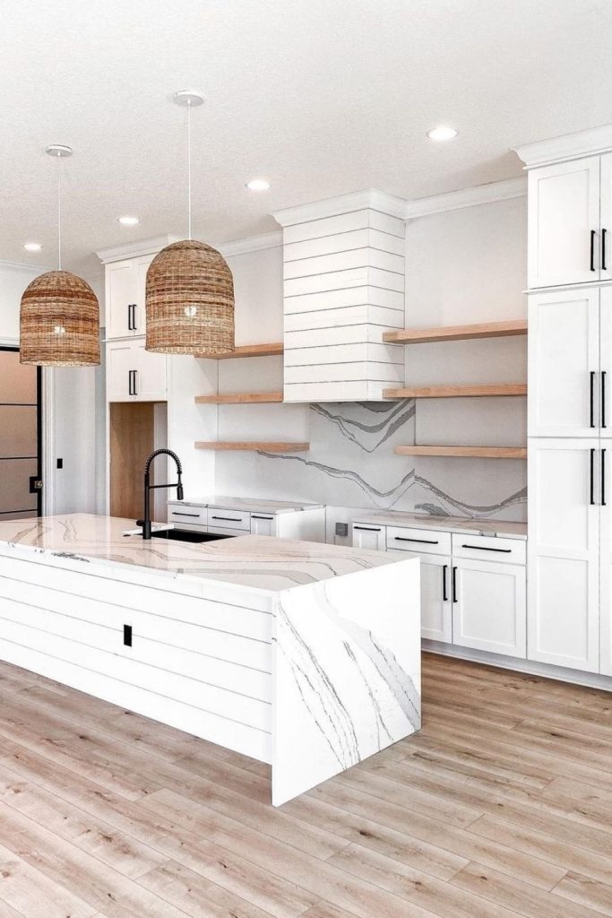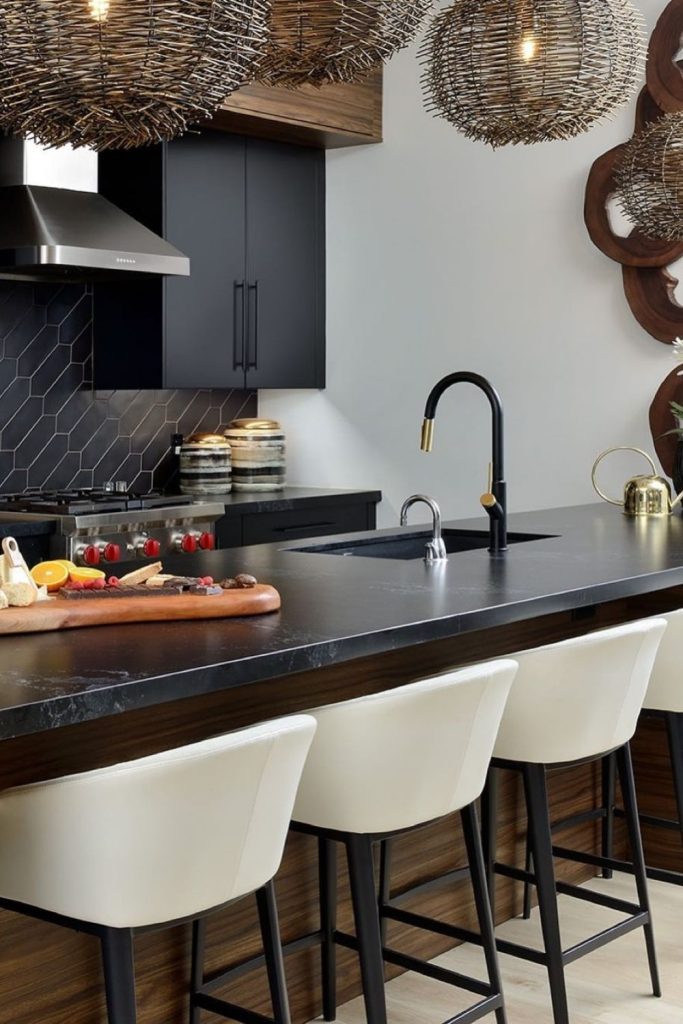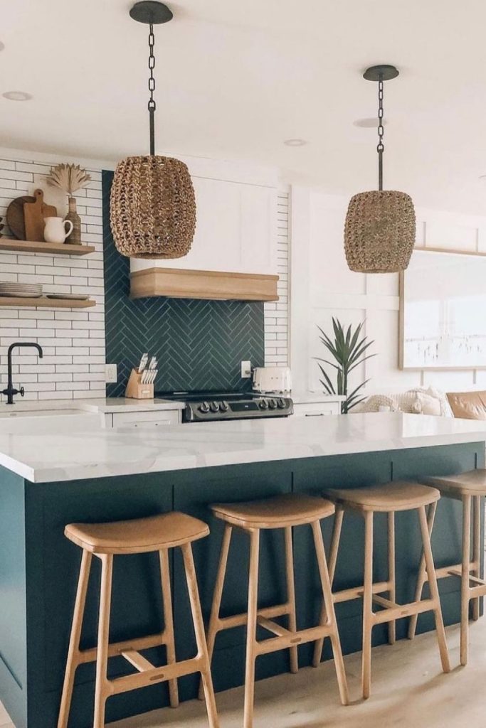This kitchen wraps you in earthy boho vibes. Warm wooden cabinets meet a textured clay backsplash, while woven pendant lights add a handcrafted touch. The neutral palette—soft browns and creamy whites—feels grounding, with a pop of greenery from potted plants. It’s a space that feels both rustic and refined, perfect for cozy dinners. To get this look, layer natural materials like wood and woven textures with subtle earthy tones. I’m obsessed with the organic feel here! How do you bring nature into your kitchen? Share your favorite decor trick in the comments!