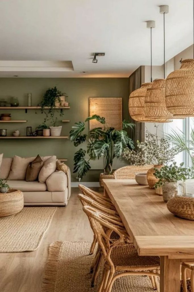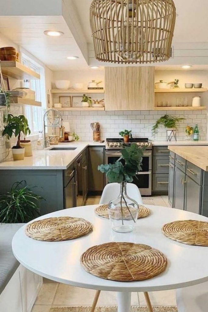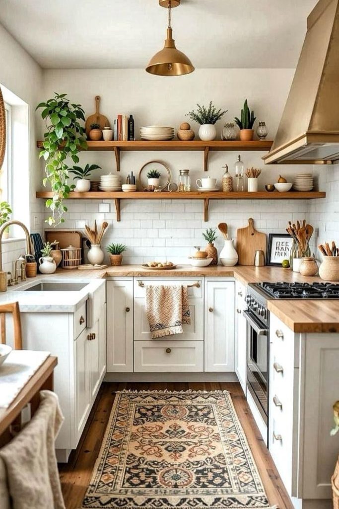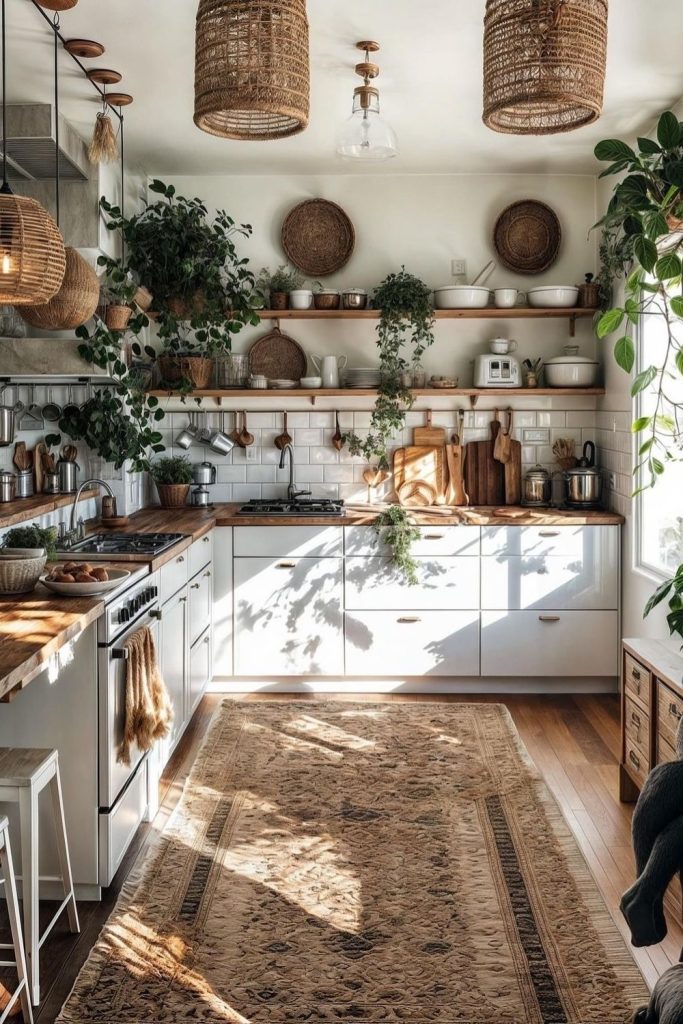 This timeless boho kitchen feels like a warm embrace. Wooden cabinets and a jute rug create an earthy base, while woven baskets add texture. Soft sage green accents and brass hardware bring a touch of elegance. The neutral palette feels both cozy and sophisticated, perfect for everyday meals or special gatherings. To get this look, mix natural materials with subtle metallic touches. I’m loving the elegant yet relaxed vibe here! What’s your go-to way to add timeless charm to your kitchen? Share your ideas in the comments and let’s inspire each other!