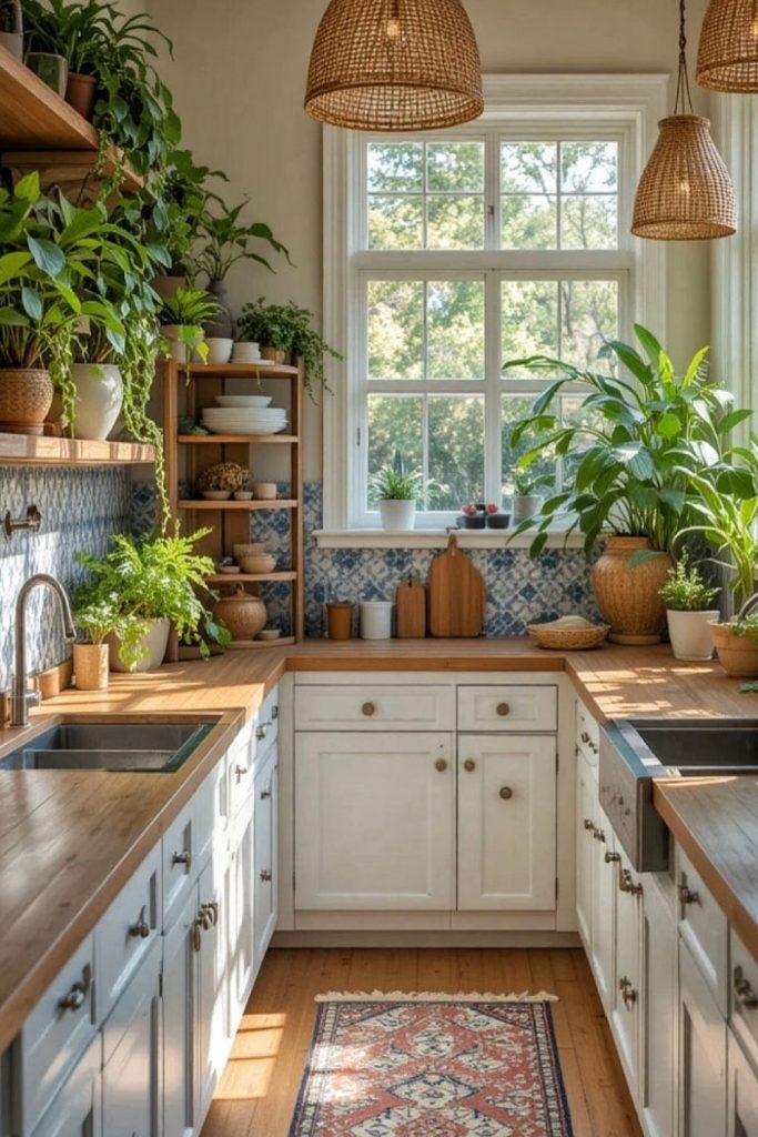 This kitchen is a serene boho escape. Soft white walls and wooden shelves create a calm backdrop, while a woven rug adds cozy texture. Potted plants and earthy ceramics bring life and warmth, tying into the sustainable trend. The neutral palette—creams and soft browns—feels so peaceful, perfect for quiet mornings. To get this look, focus on natural materials and a minimalist approach. I’m obsessed with the tranquil vibe here! How do you create a serene atmosphere in your kitchen? Share your tips in the comments and let’s swap calming decor ideas!