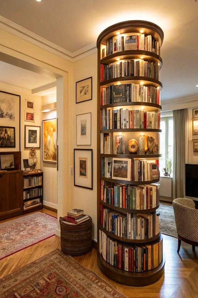 That round shelf painted mud-color is great. Woven boxes, tall, soft grass, and rope plant hangers say relaxed, rich boho style. Books sit flat and straight. There are no set rules here. The cane chair next to it makes the spot feel like a warm place to read. You will not want to leave.