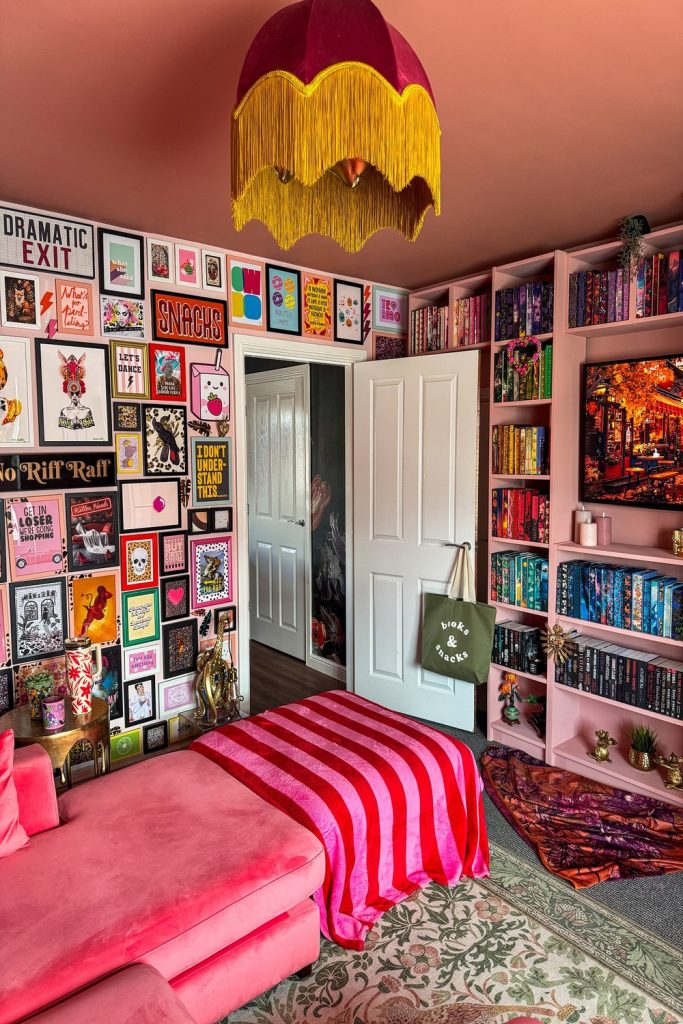 Hot pink walls, gold-trimmed shelves, fashion coffee table books stacked like skyscrapers, crystal decanters, and a giant clamshell bowl. Leaning mirrors, framed Hermès scarves, and a chandelier dripping in crystals. It’s giving “I have fabulous taste and zero chill” and I’m here for every over-the-top second.