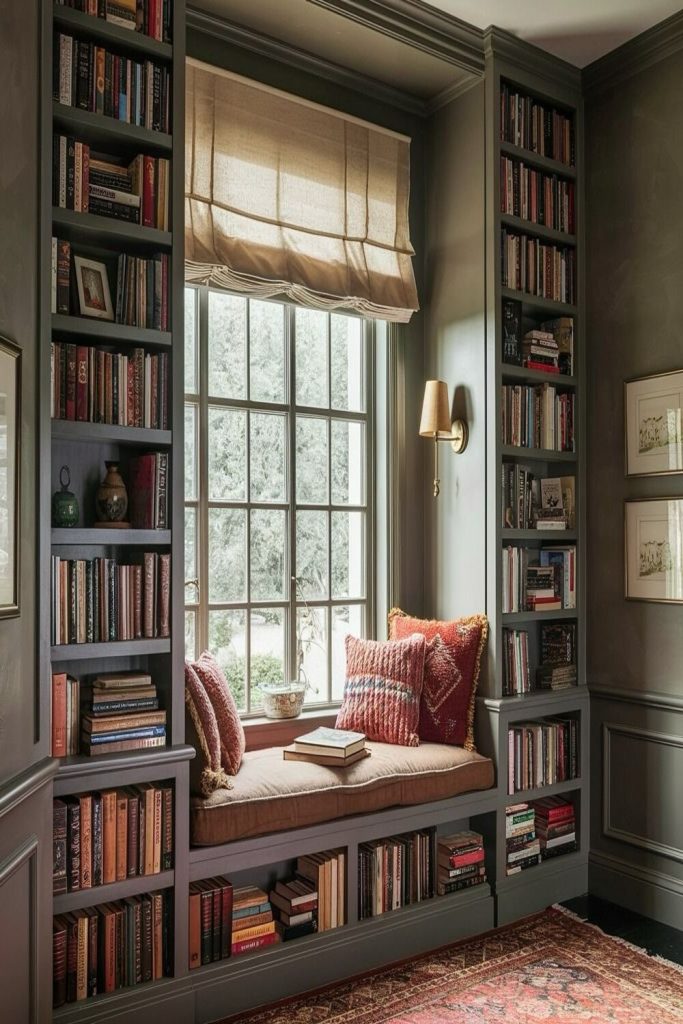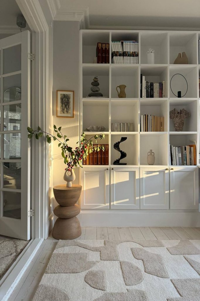 This is the best soft color dream. The light white shelves have a soft finish. They are full of light rock pieces, stone shapes, cloth books, and dull white cups. All things are the same tone. A soft, round seat sits below like a cloud. There is no bright color. But it is not dull. The feel of the things does all the work. I used this color plan at my house last year. People still ask how it looks so rich with no effort. The fix: cut out what you do not need. Let nice things speak for the style.