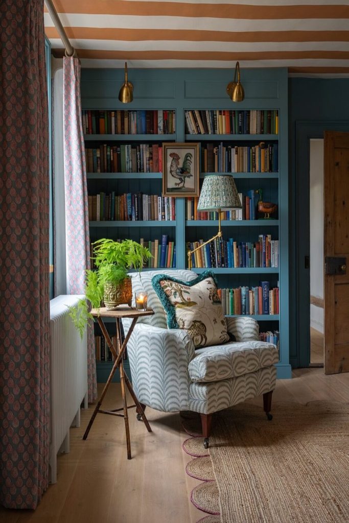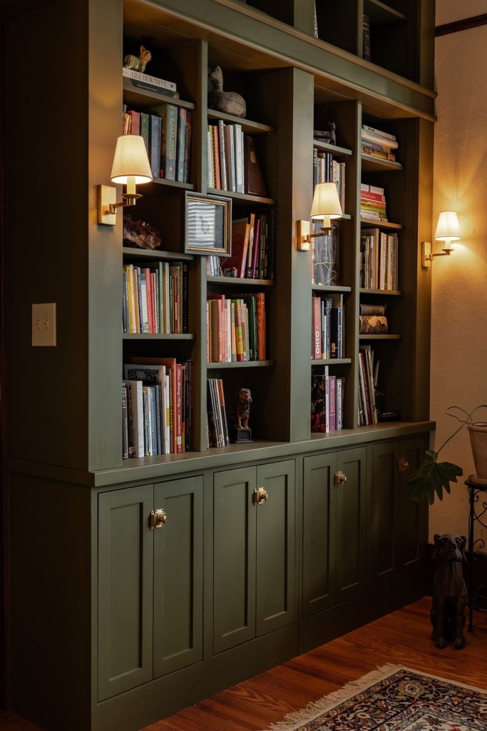 Floor-to-ceiling shelves painted in Farrow & Ball “Hague Blue,” then styled with warm brass picture lights, antique globes, and creamy art books. The brass hits against the deep blue feel like jewelry. A velvet emerald chair and Persian rug ground it all. It’s giving old-money private club but make it cozy. I’ve used this exact color in a client’s study and they say it’s impossible to feel stressed in there—mission accomplished.