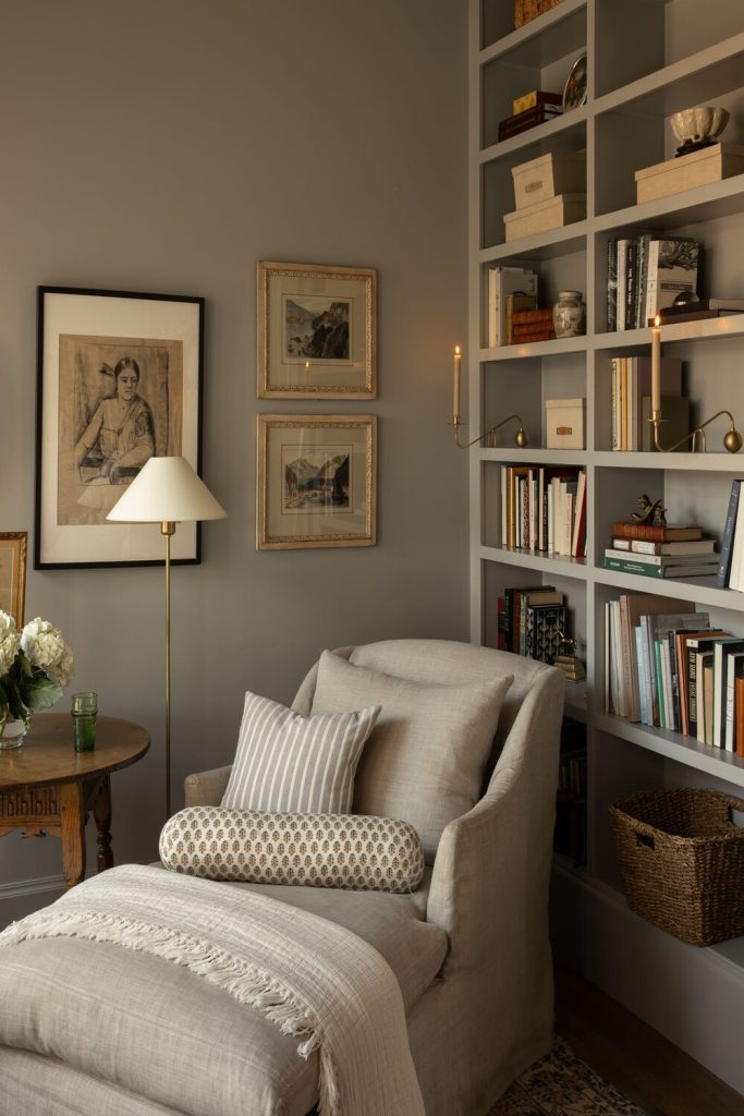 Soft gray-washed shelves filled with blue toile ginger jars, lavender bundles, vintage silver candlesticks, and dog-eared French novels. A faded Aubusson rug and bergère chair complete the fantasy. It smells like Provence even through the screen. If your Pinterest board is 90 % French countryside, you need this photo tattooed on your brain.