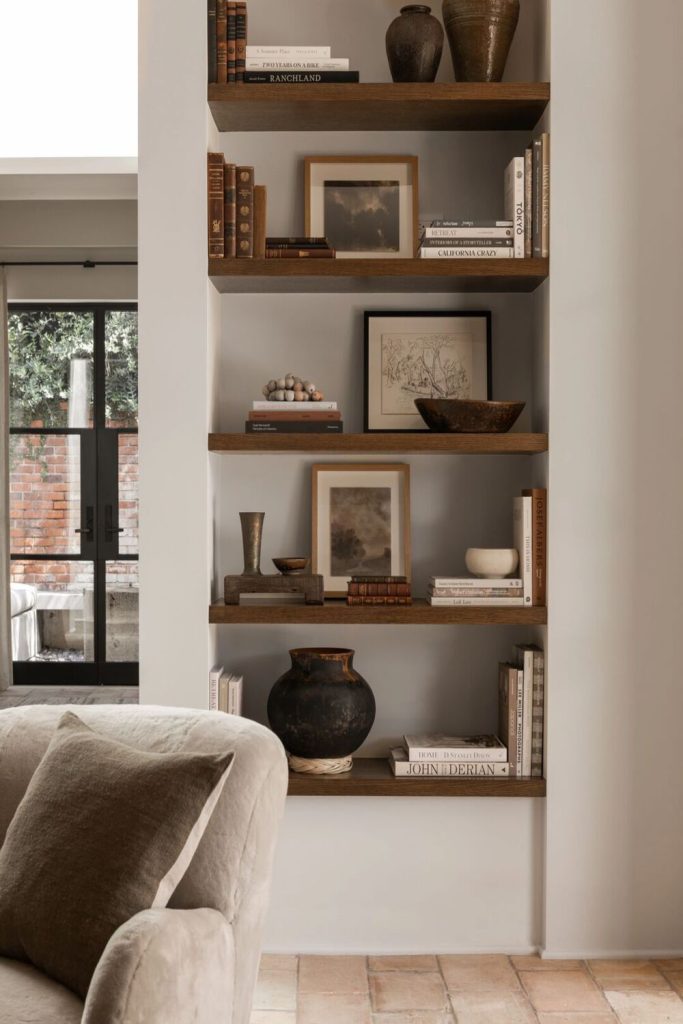 Chunky handmade pottery in sand and clay tones, wavy wooden bowls, books with raw linen covers, and tons of dried palms. The shelves themselves have an irregular live-edge that makes my heart happy. Paired with a cream sofa and jute rug, it’s organic modern at its softest and most touchable.