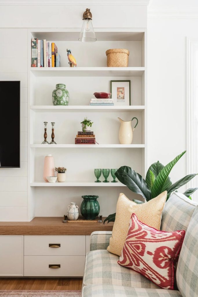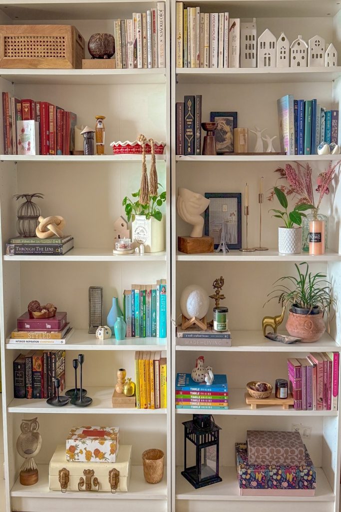 Every color of the rainbow, proudly on display and zero apologies. Books sorted by hue, mixed with retro radios, ceramic leopards, old typewriters, and a disco ball (because why not?). Plants dangle from the top shelf like they’re dancing. It’s the shelf equivalent of a great thrift haul—joyful, unfiltered, and packed with personality. Save this one if your home motto is “more is more.”