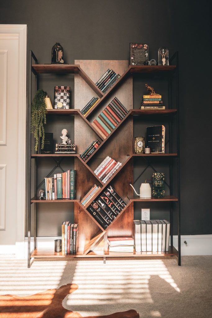 I love books set in rainbow order. I love them with fun old items. Brass birds, old photo boxes, and art book piles make this dark shelf fun. The small steps give us that dream of a library. I love how plants hang from the top. It feels real and calm. If you get things over time, this plan is for you. Do not worry if things do not match!