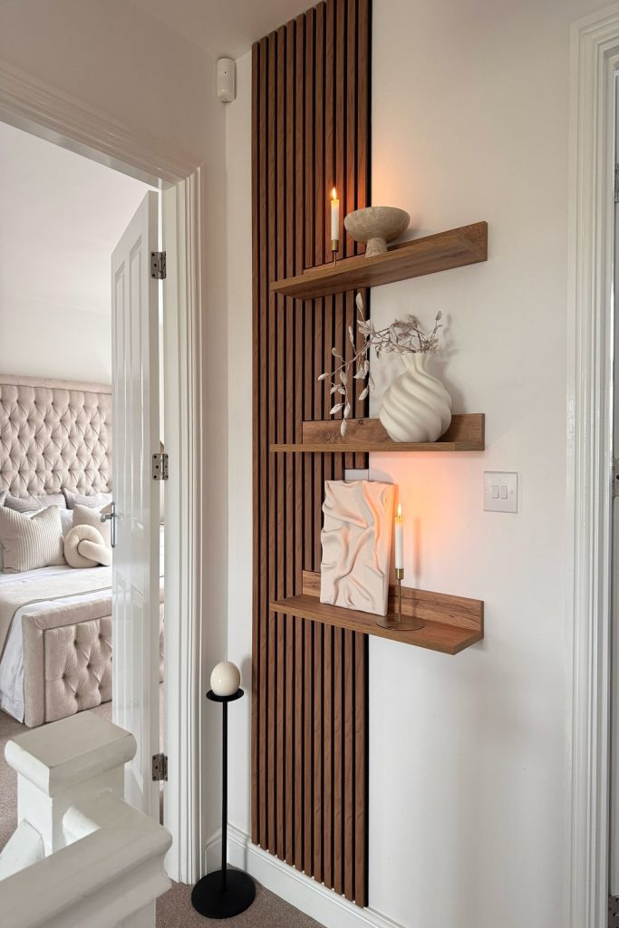 Clean-lined oak floating shelves, black metal brackets, books facing spine-in again (I’m obsessed), broken up by simple black vases and one perfect wood bowl. A linen sofa and sheepskin below keep it cozy. The negative space is generous, the palette limited to three materials, yet it never feels cold. This is minimalist that still feels like home—my go-to recipe when clients say they’re scared of “empty.”