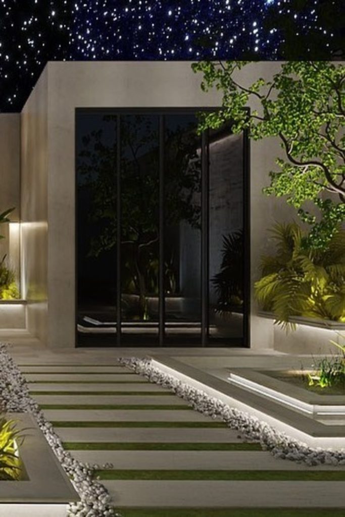A simple look does not have to feel cold. This way uses stone and water. It brings peace. A house like this would calm my heart! I love the lights here. Use small bulbs. They show off a stone wall or a tree. Do not forget your “night look.” Good lights make your yard safe. They make it pretty when the sun goes down.