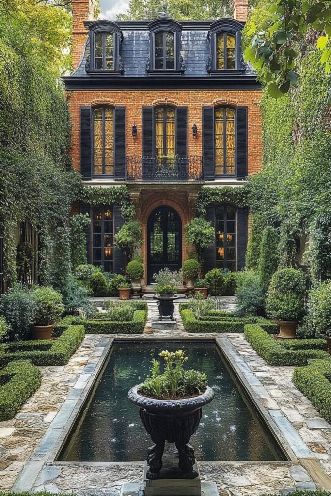 If your home looks old and grand, use a match. This yard uses pairs of plants. It uses lamps to frame the front door. It is a style that never gets old. It makes things look even and neat. This “tidy” look is great if you want to sell your home. It looks clean. It is well-kept. It is simple, grand, and always right.