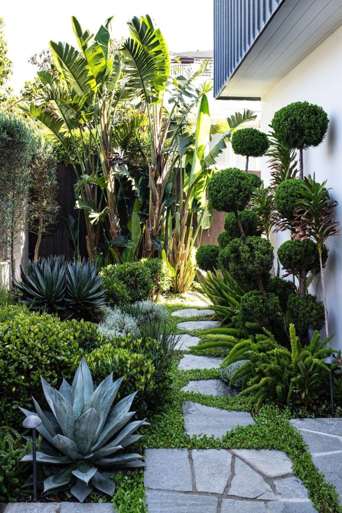 Who says you need a beach for a trip? This yard uses big leaves. It uses palms to make a lush home. You can do this in cold spots too. Just use plants in pots. I love the look of many layers here. It makes a screen for peace. It feels real. It is a bold choice. It will make a mark in your street.