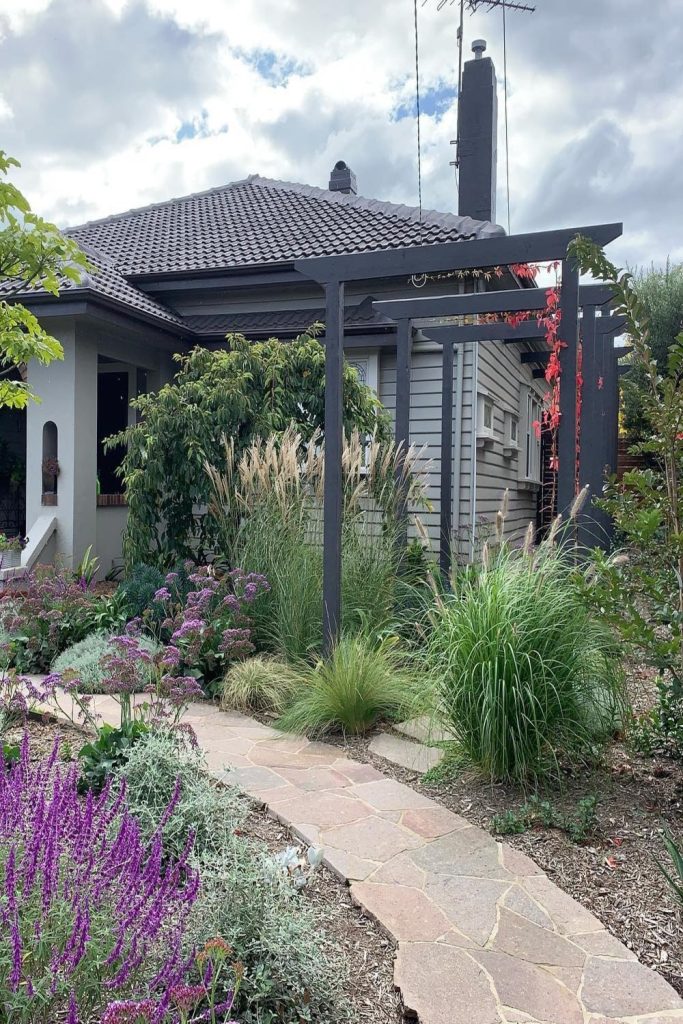 Do you want a “wow” feel? Look here. This yard uses bright tints. It makes the door pop. I love to use flowers in big pots. You can swap them as the days get cold or hot. Use bulbs in spring. Use mums in the fall. It is a great way to try colors. You do not have to change the whole yard. Pro tip: pick one tall plant and one full plant. Pick one that hangs over the edge!