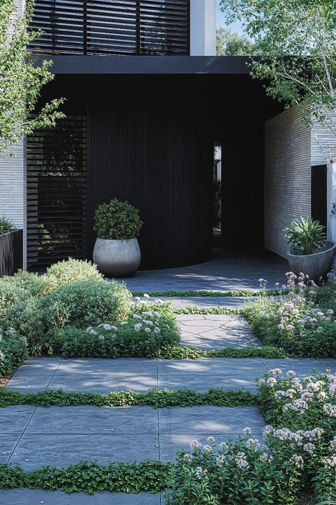 For a sleek, contemporary look, large-format pavers are the way to go. This design uses “floating” concrete steps surrounded by dark gravel, which looks incredibly high-end. It’s a very architectural approach to garden decor that emphasizes shape and form over traditional flower beds. I recommend this style for anyone with a modern or mid-century home. It’s low-maintenance but high-impact—the perfect combination for a busy lifestyle.