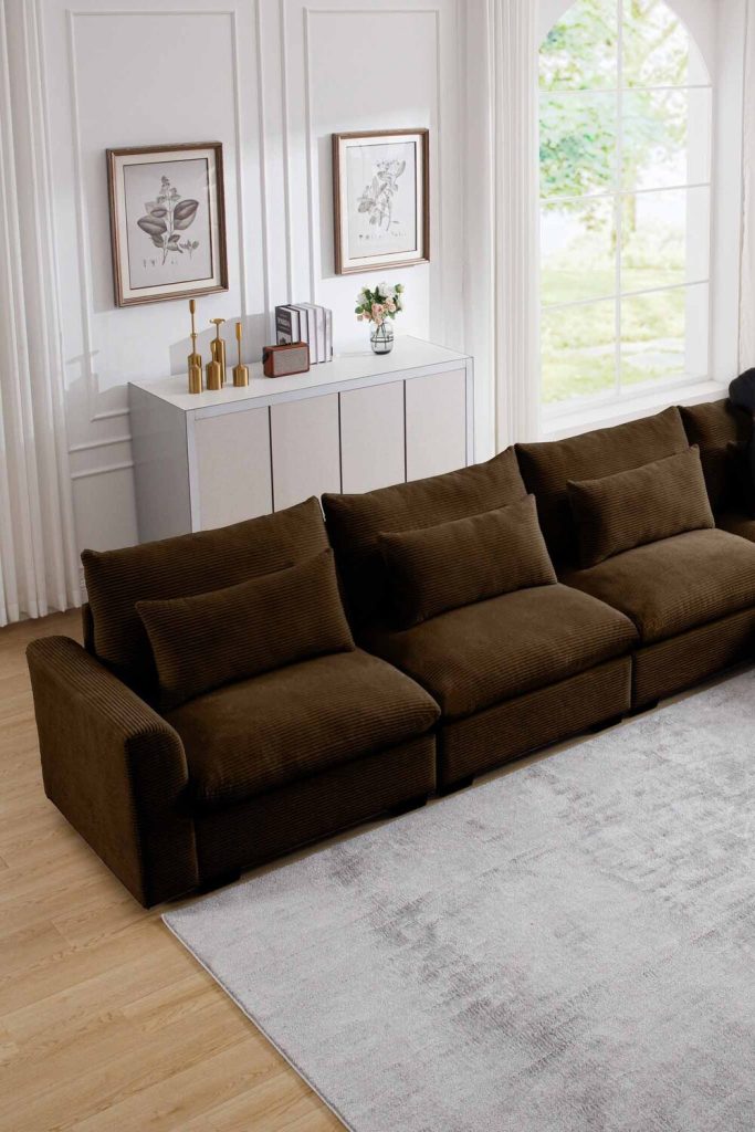Luxe on a budget—echoes a high-end project I did with thrift flips! This chocolate sofa decor shines with velvet pillows and gold frames, blending modern brown couch living room elegance. Sustainable touch: recycled glass vases. For boho brown couch fans, the textured throw adds depth. Living room refresh idea: mirror to bounce light in small spaces. Earthy living room design with a glamorous edge. Tried gold accents? Share your wins below—definitely pin-worthy for brown couch living room designs!
