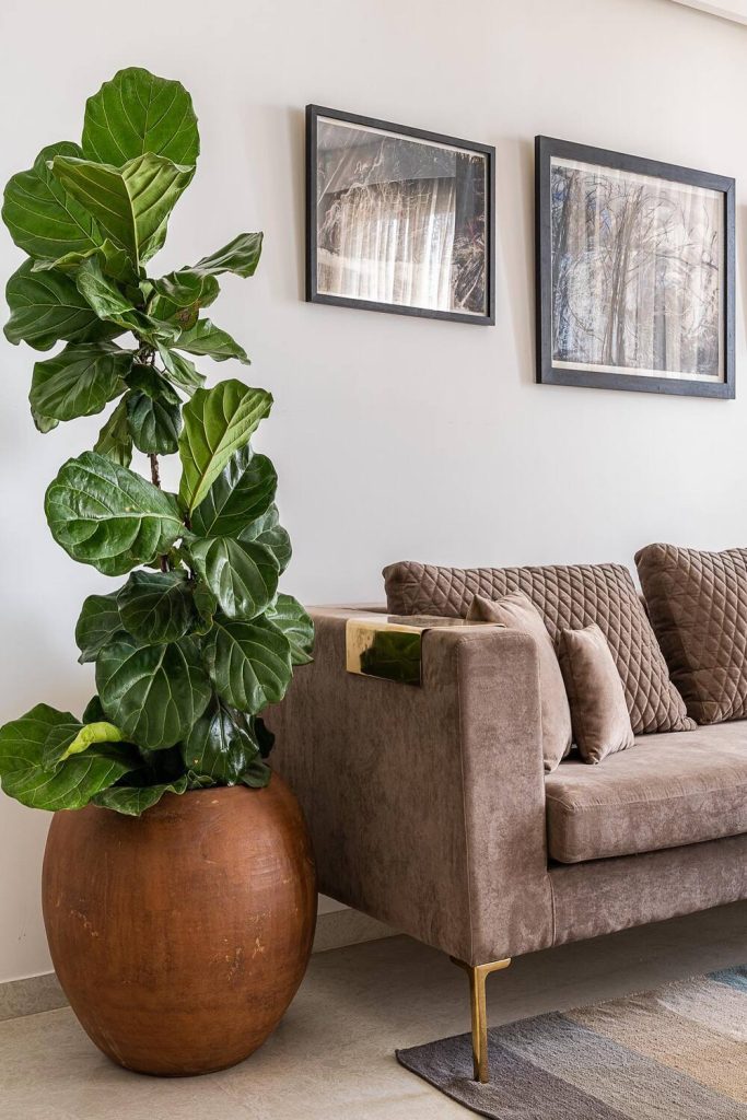 2. Modern Minimalist Brown Sofa Decor with Sleek Lines and Greenery