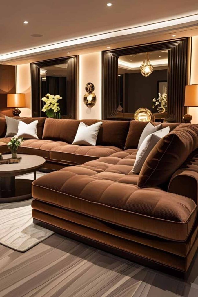7. Luxe Chocolate Sofa Decor with Velvet and Gold Accents