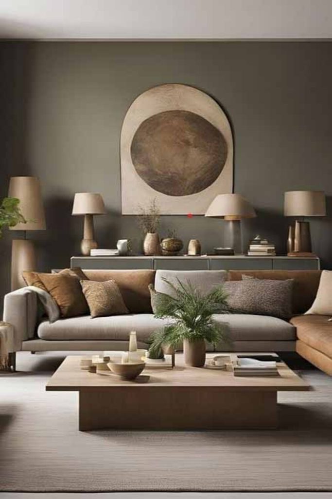 14. Tranquil Earthy Living Room Design Centered on a Sectional Brown Sofa
