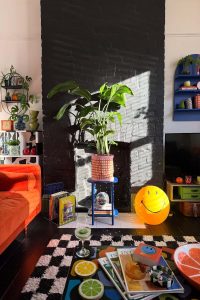 4. Eclectic Leather Brown Couch Styling with Bold Art and Patterns