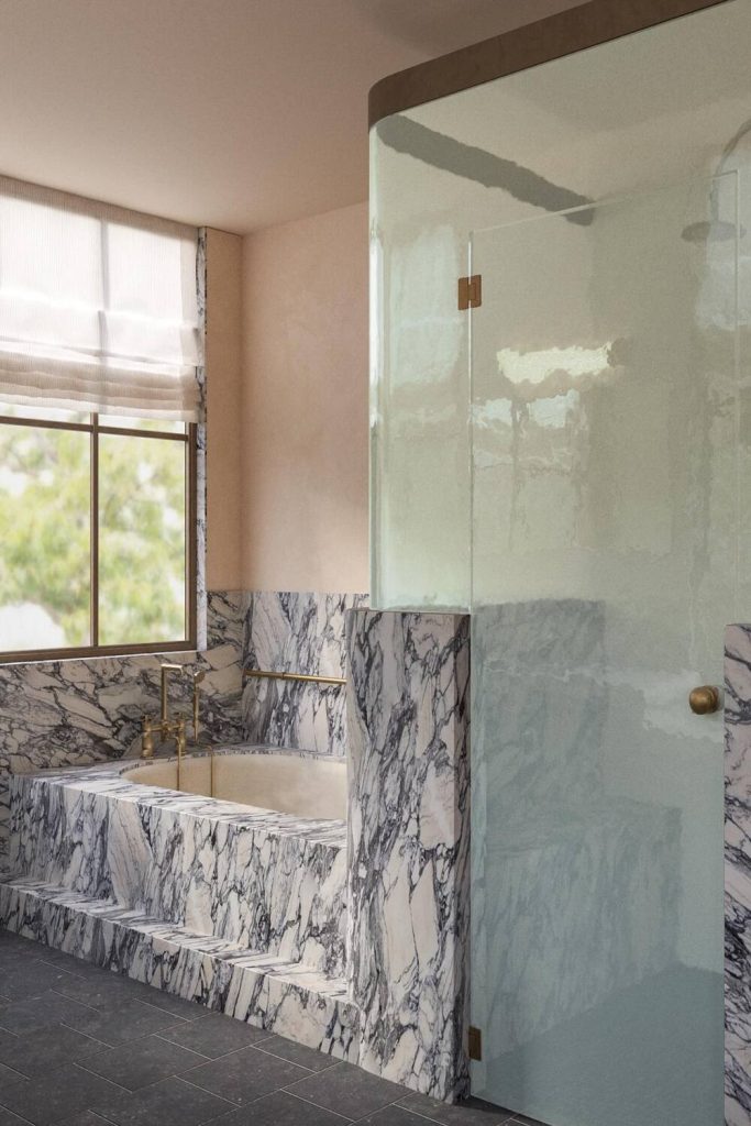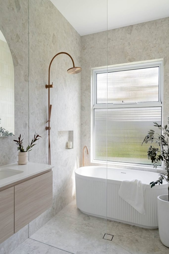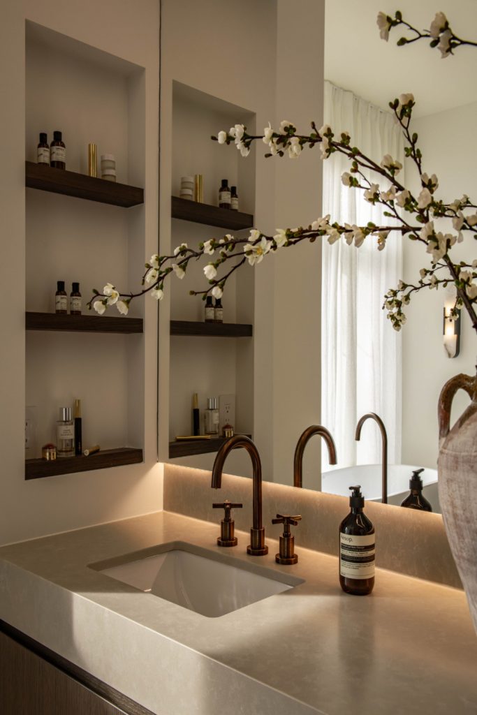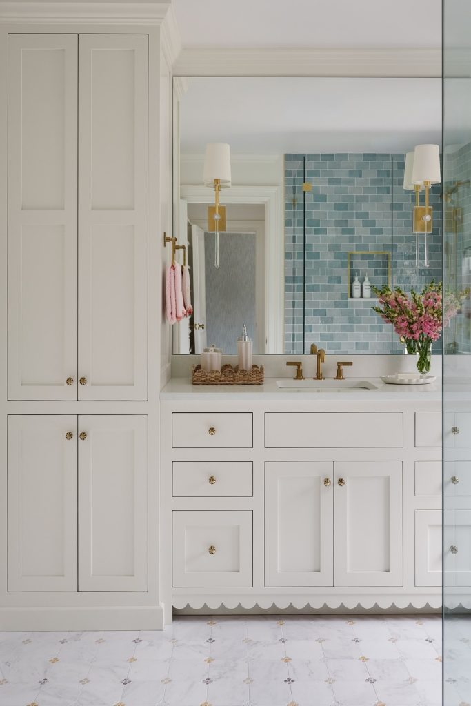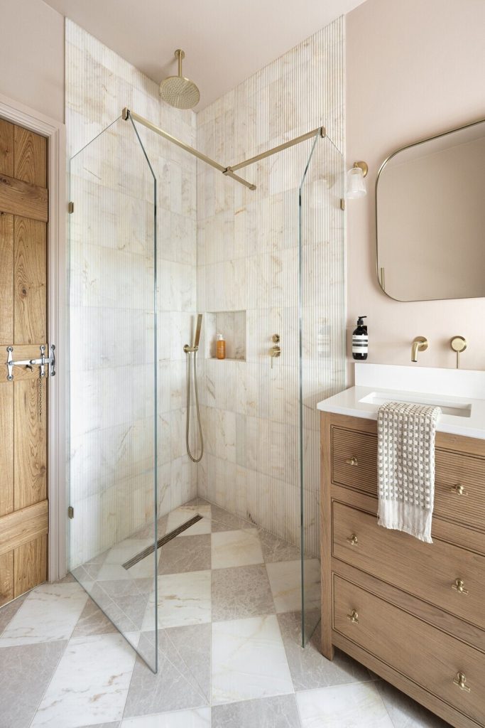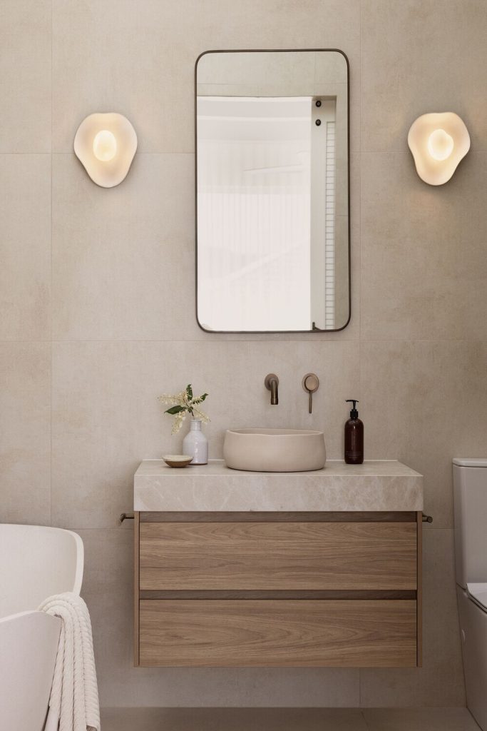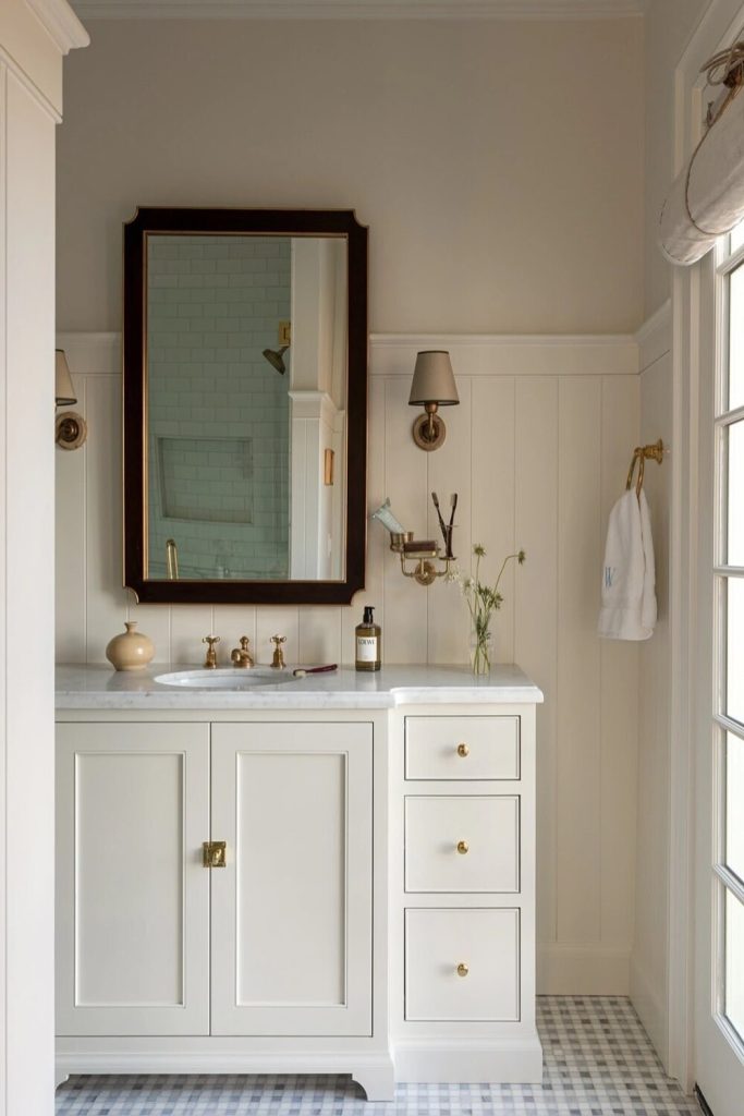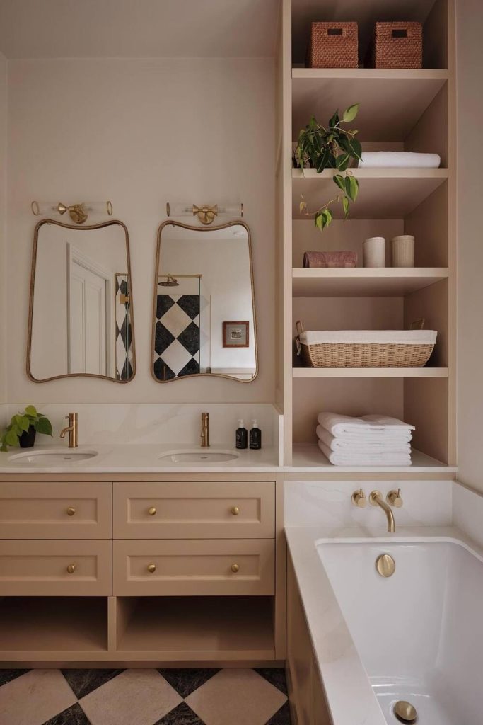 Blush pink isn’t just for bedrooms. This soft rose wall (behr’s “first blush” maybe?) with brass fixtures feels fresh yet timeless. I’ve painted accent walls in rentals with landlord-approved low-VOC paint; easy to prime over. The scalloped mirror adds whimsy. For bathroom vanity styling, limit to three objects: soap, plant, tray. Keeps it serene. Save this for your next renter-friendly bathroom refresh moodboard.