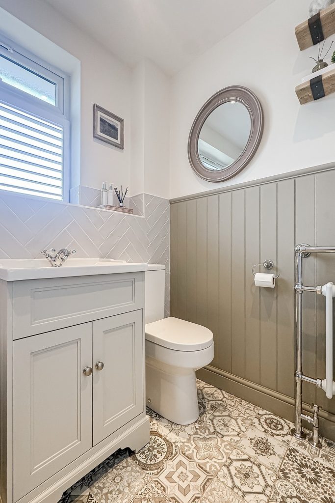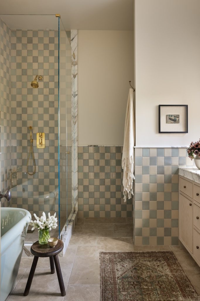 These mint penny tiles are joy in grout form. If painting tiles isn’t an option, try tile stickers—peel off later. The wood stool and woven basket keep it grounded. I’ve used similar in a kid’s bath; durable and fun. Perfect for anyone tired of white.