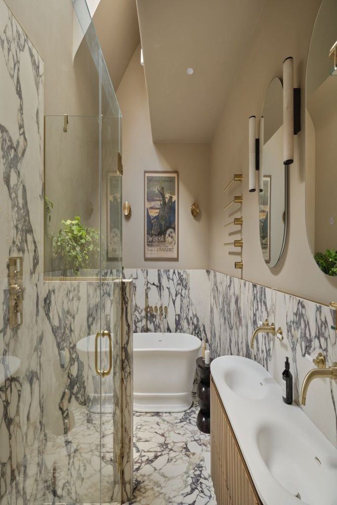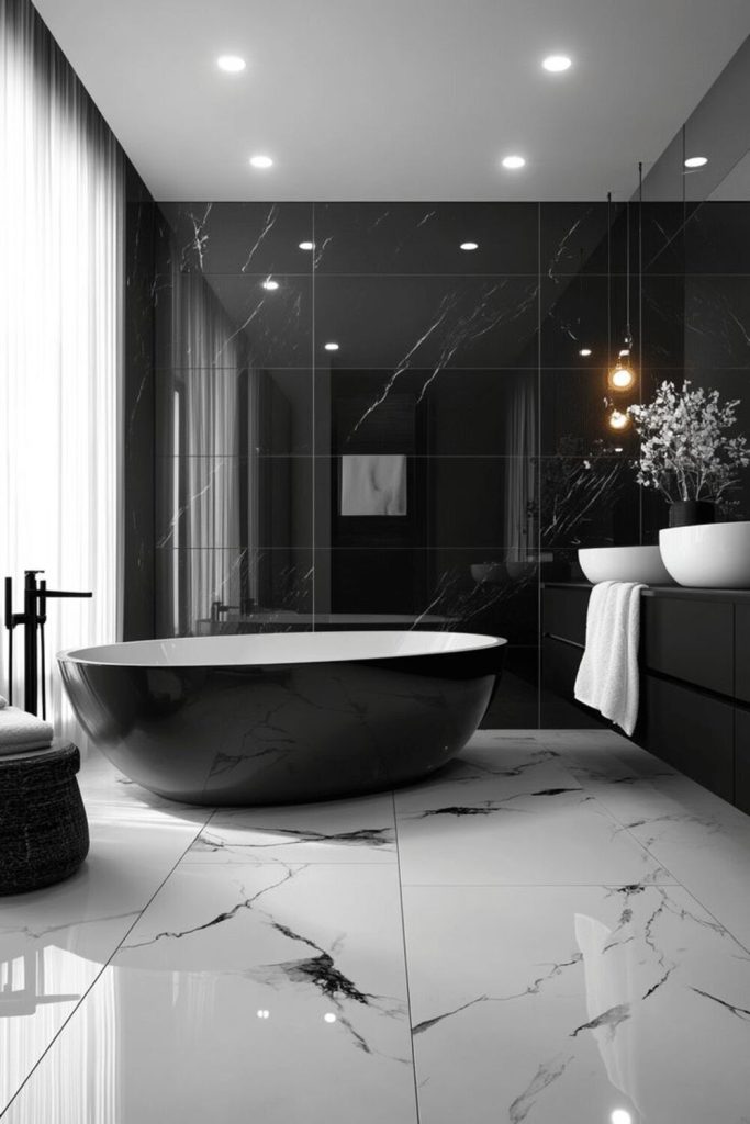 This modern farmhouse bathroom is proof matte black never goes out of style. The hexagon marble floor (peel-and-stick, I bet) reflects light to make the room feel bigger—optical illusion 101. I’ve installed similar tiles in my last rental; they peel off cleanly after two years. The wood vanity warms up the cool tones, while open shelving displays rolled towels like art. Add a eucalyptus bundle for that spa bathroom on a budget scent. Steal this for your apartment bathroom storage hacks!