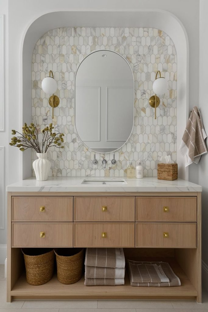 Curved mirrors are everywhere in 2025 small bathroom decor. This one softens sharp lines and reflects light beautifully. I found a dupe on Wayfair for $80. The fluted vanity adds subtle texture—try peel-and-stick panels if DIY scares you. Keep counters bare except for a ceramic tray. Less is more in apartments.