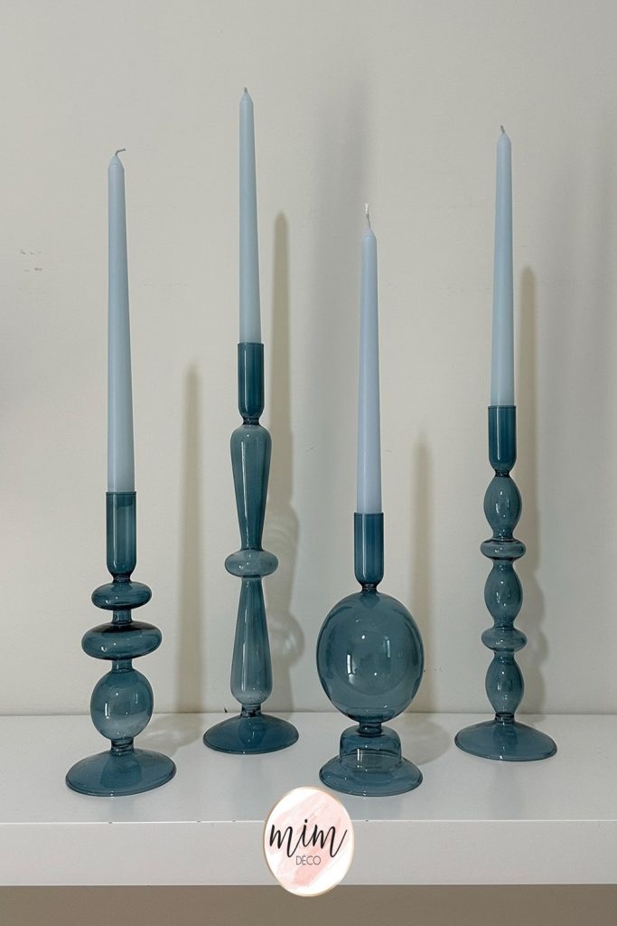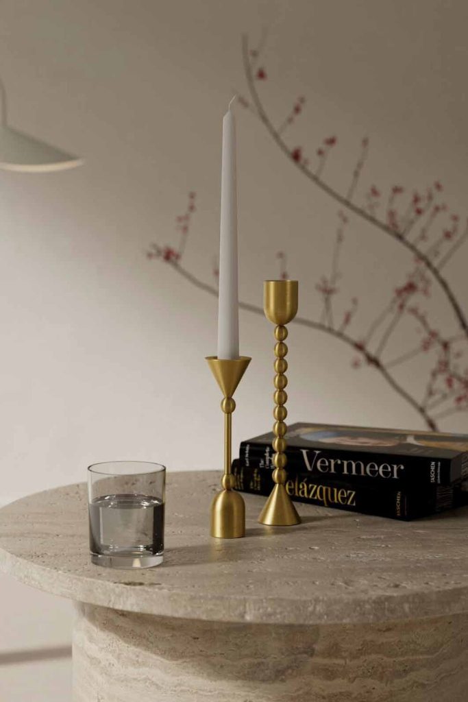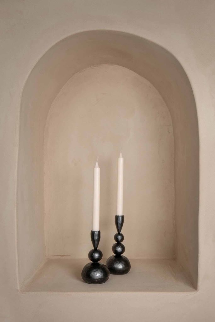 Skinny brushed nickel taper holders lined up on floating shelves—understated elegance. The cool metal tone works so well with art prints and ceramics. I love how they disappear visually until you light the candles, then suddenly the whole wall glows. Perfect if your style is “barely there but beautiful.”