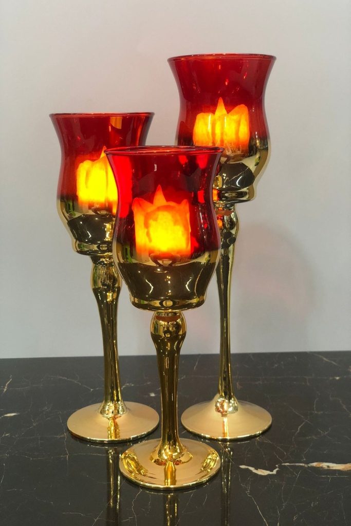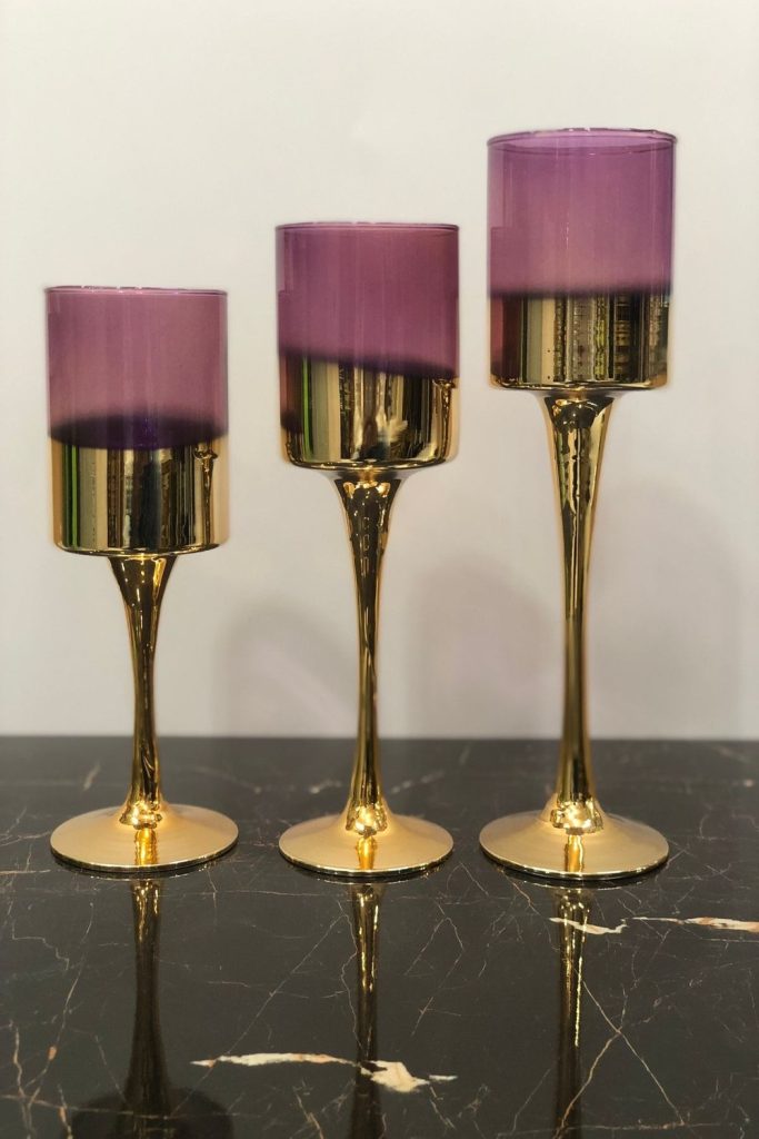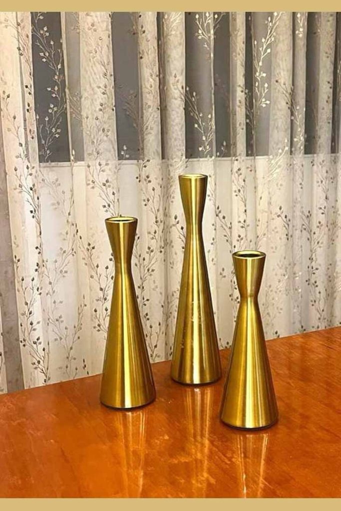 This set of three metal holders screams rich holiday meal. They are of mixed heights. They sit on a cloth runner. White candles and cedar are there too. It looks neat but not too formal. Brass makes cool colors warmer fast. These holders reflect the flame well. They look great in dim light. I use mine every fall. They look new even five years later.