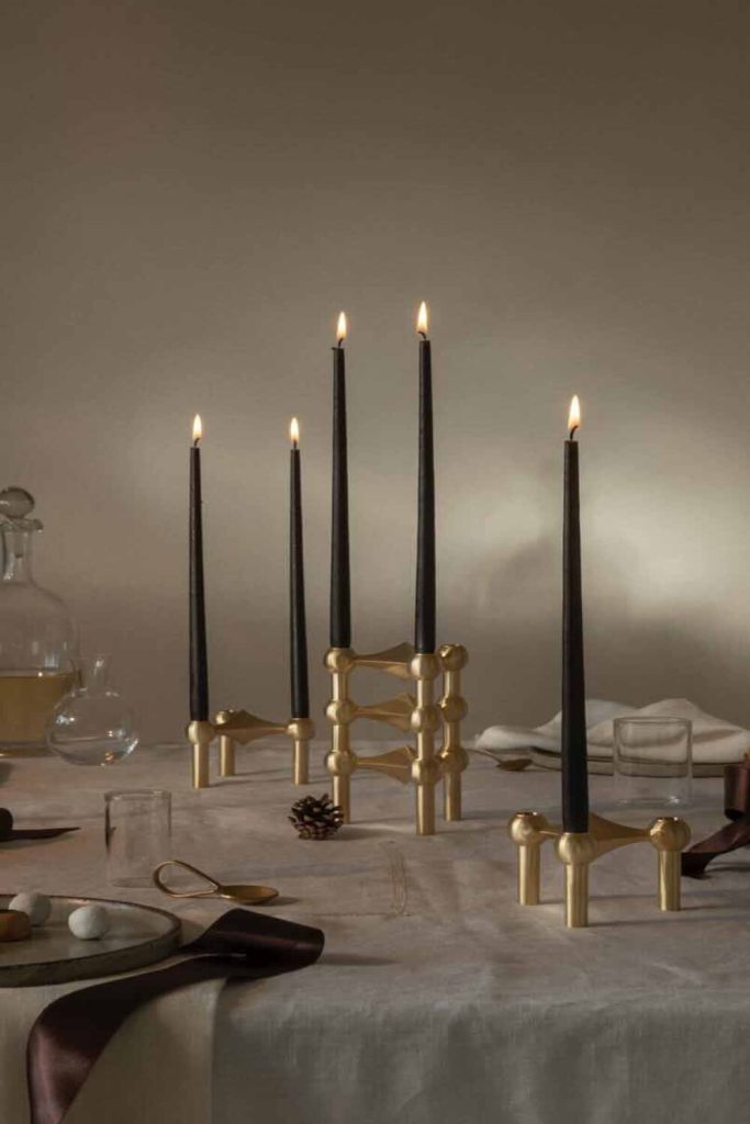 4. Gold Brass Pillar Candle Holder Set on a Festive Holiday Table