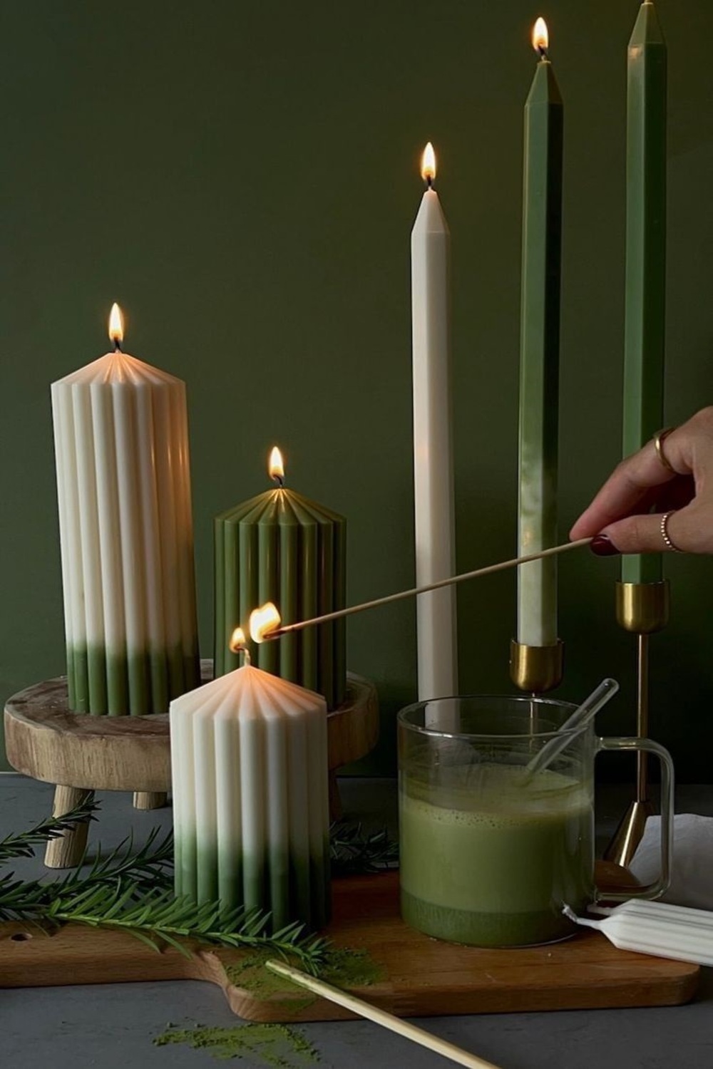 These tall, matte black metal holders look bold. They feel new and cool. They hold big, cream candles. Dried orange slices and green leaves are next to them. The shelf feels both costly and warm. The black looks great next to warm wood. This is perfect if you fear dark colors. Expert tip: Use an odd number of heights. This makes a good balance.