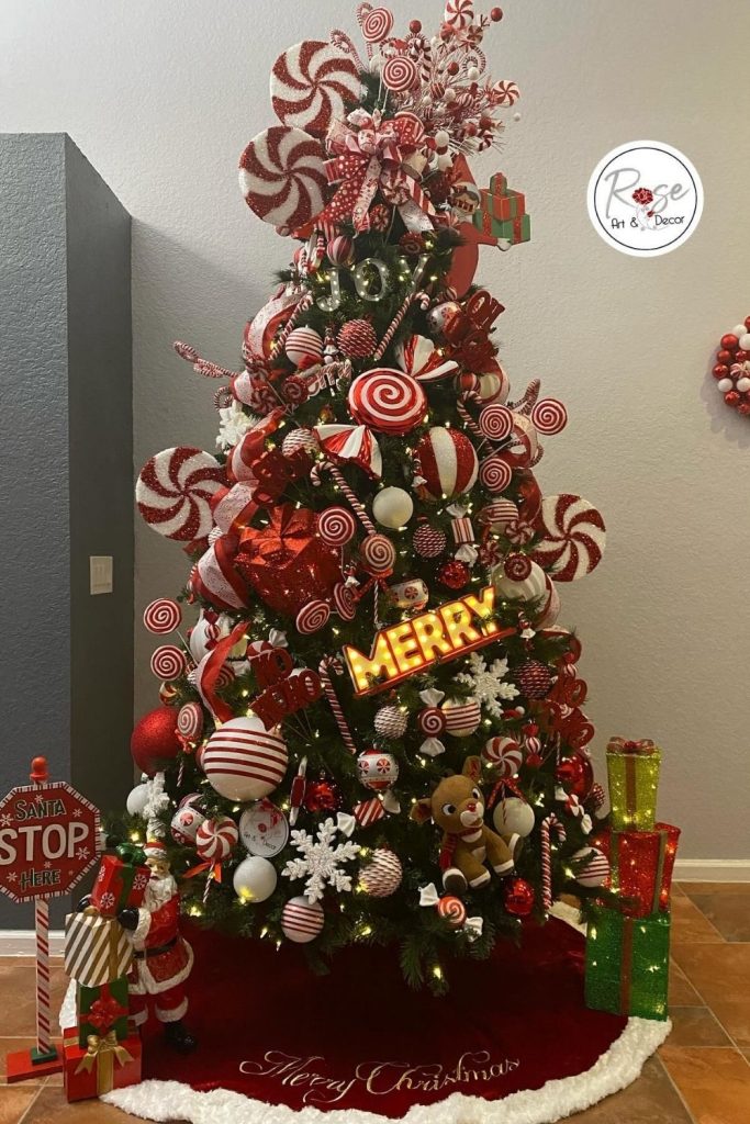 This candy cane Christmas tree is pure glamour! Oversized red-and-white ornaments and sparkling ribbons make it a showstopper. The metallic accents add a trendy, luxurious vibe, perfect for a chic holiday party. I love how the tree balances bold decor with sustainable elements like reusable baubles. Pro tip: use warm lights to enhance the glow. This tree makes me want to dress up my space! Pin it for glam inspiration and share your bold decor ideas below—how do you make your holidays sparkle?