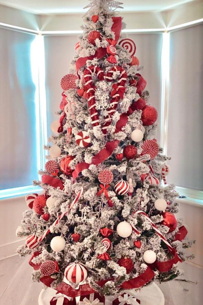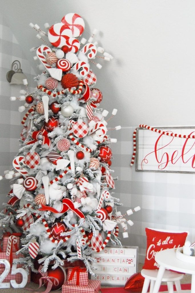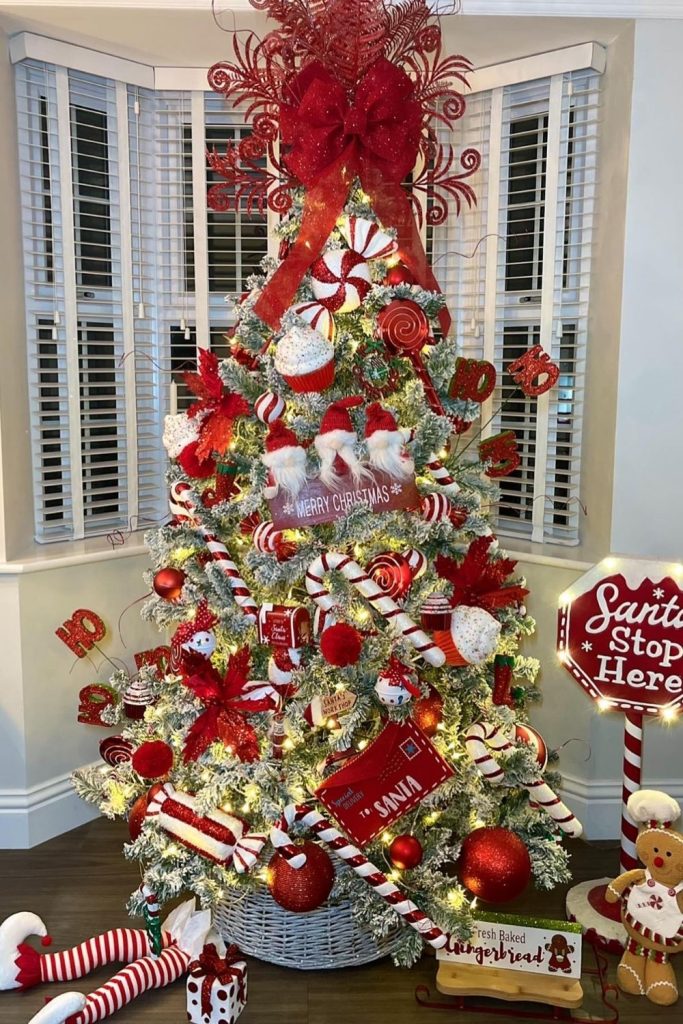 This candy cane Christmas tree is all about less-is-more magic. Sparse branches adorned with sleek red-and-white ornaments and a single oversized candy cane topper create a modern, cozy vibe. The neutral backdrop of the room lets the tree’s bold stripes pop. I’m obsessed with how this look embraces sustainable decor with handmade felt ornaments. It’s proof you don’t need a ton of decor to make a statement. Want to try this chic style? Pair it with metallic accents for extra flair. Pin this for inspiration and tell me how you’d style it!