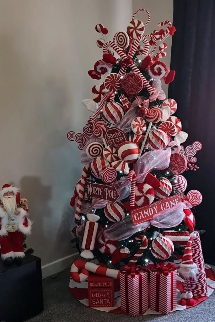 This candy cane Christmas tree exudes elegance. Delicate red-and-white ribbons cascade down the branches, paired with crystal ornaments for a refined look. The soft lighting enhances the tree’s sophisticated charm, making it ideal for a chic holiday gathering. I’m obsessed with how the candy cane theme feels luxurious yet approachable. Pro tip: add metallic accents for extra glamour. This tree inspires me to elevate my holiday decor! Pin this for a dose of elegance and share your tips for a sophisticated Christmas setup in the comments.
