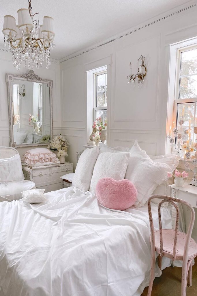 This bedroom is a serene escape with its crisp white walls and soft pink bedding. A garland of pink and white ornaments drapes across the headboard, adding a festive touch without clutter. The natural wood nightstand holds a simple candle, keeping the look minimal yet warm. It’s a great example of cozy minimalism for the holidays. Try swapping one pillow for a pink accent to start small. Pin this for your Christmas bedroom decor ideas and let me know your favorite holiday styling tips!
