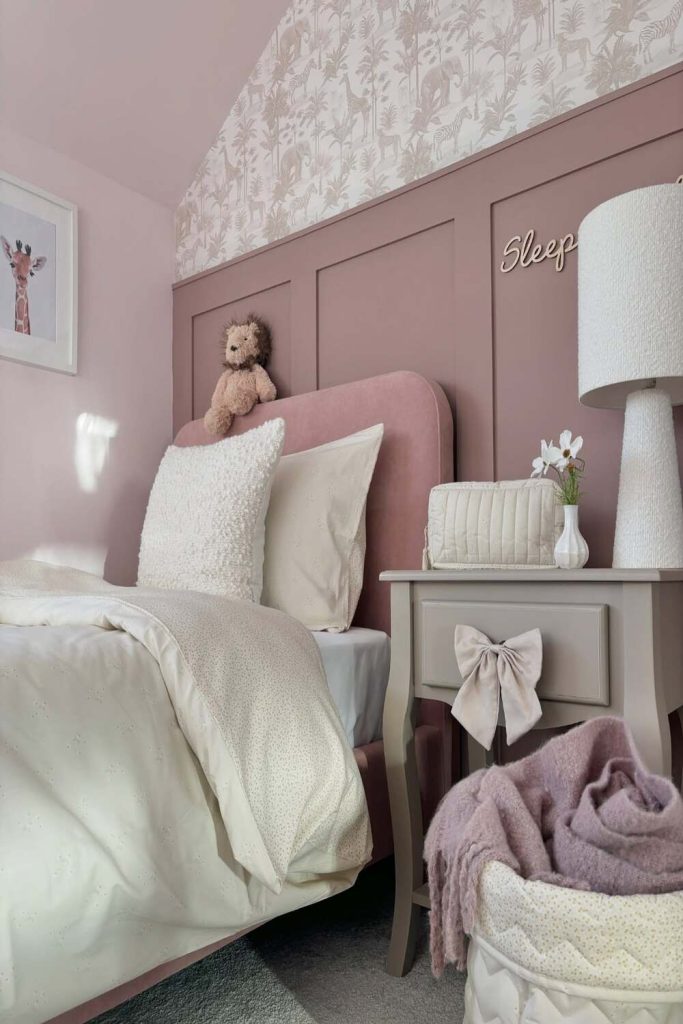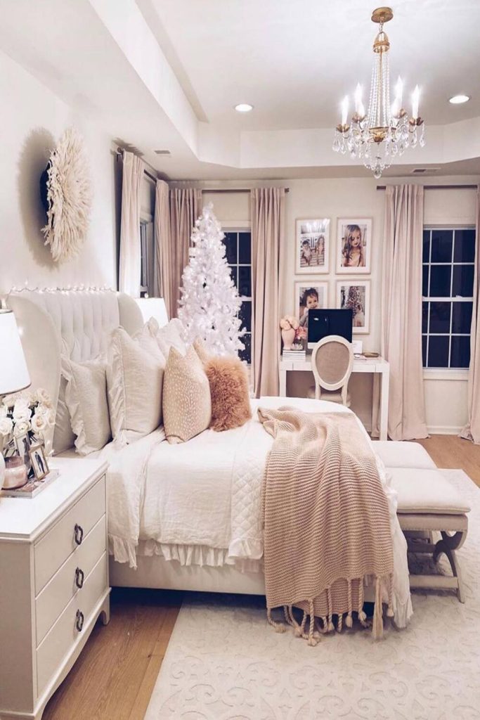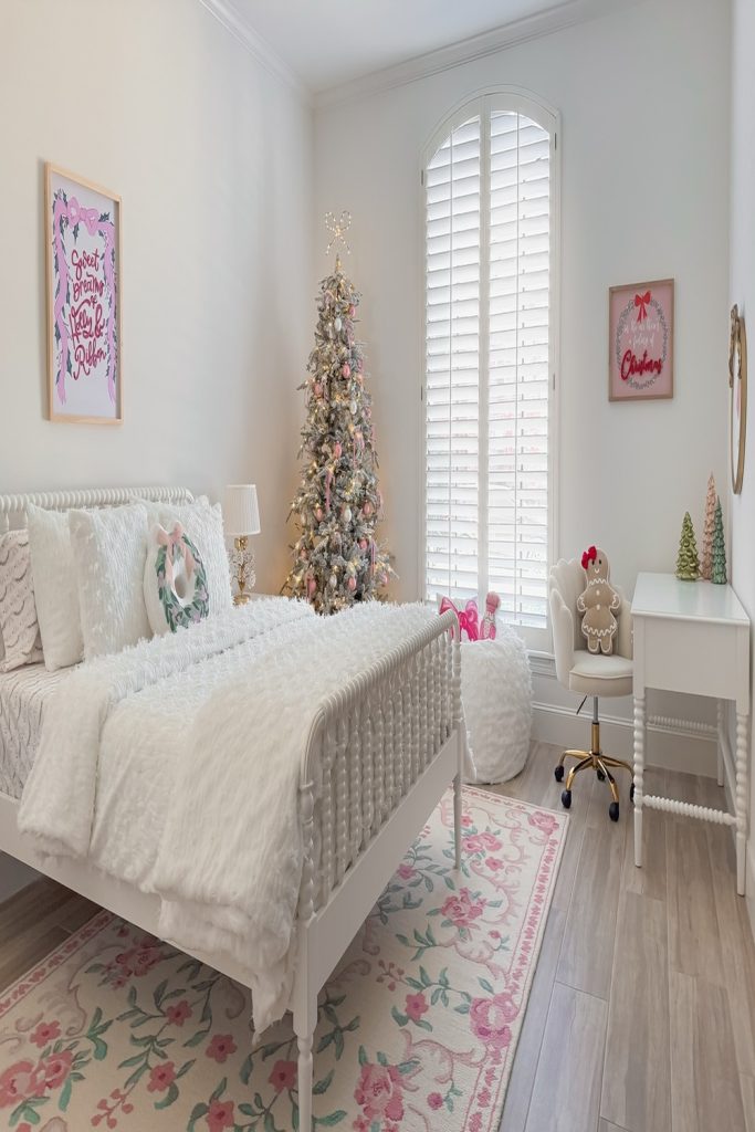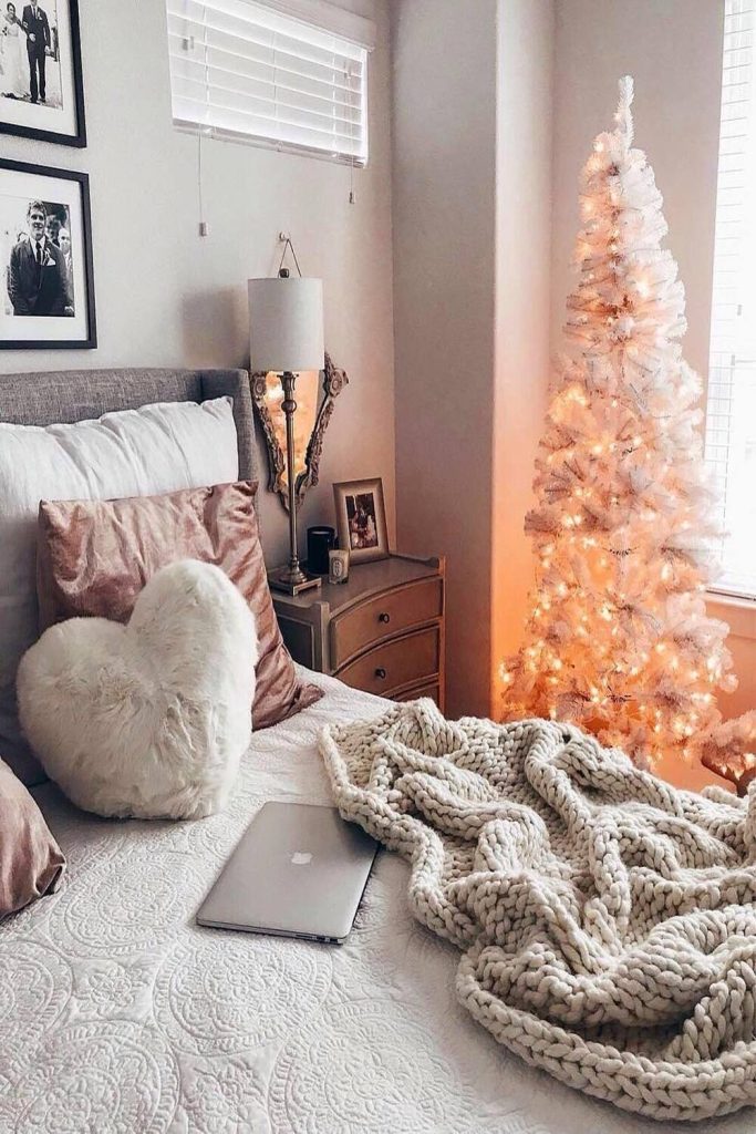 This bedroom radiates warmth with a pink knitted throw and fluffy white bedding. A small Christmas tree with pink baubles sits on a woven tray, adding festive charm. The soft lighting and natural textures create a cozy, inviting space. It’s a great example of blending pink accents with holiday cheer. Try layering textures for a warm holiday feel. Pin this for your Christmas bedroom decor ideas and let me know how you’re styling your cozy retreat!