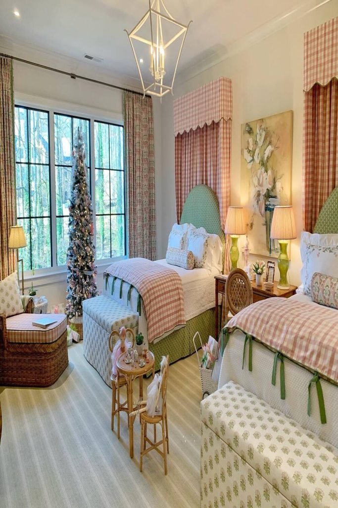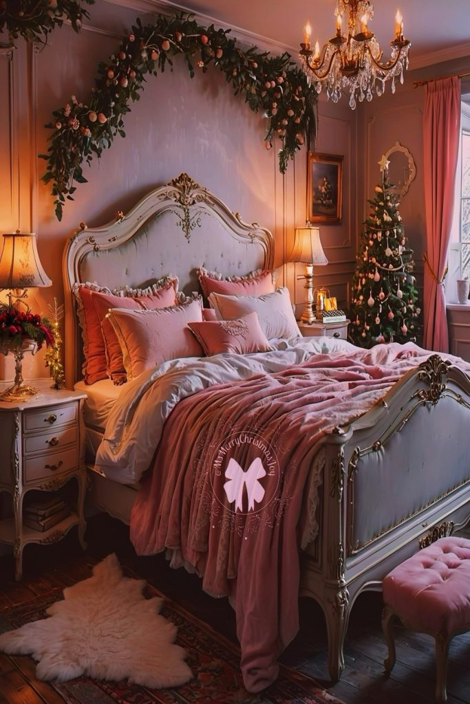 This bedroom channels vintage charm with a dusty pink quilt and brass accents. A small Christmas tree with pink ribbons and glass ornaments sits on an antique nightstand, creating a nostalgic holiday vibe. The soft lighting from a ceramic lamp adds coziness. It’s a timeless look that blends old-world charm with modern trends. Add a vintage-inspired pink throw to your bed for instant holiday magic. Pin this for inspiration and share your vintage decor ideas in the comments!