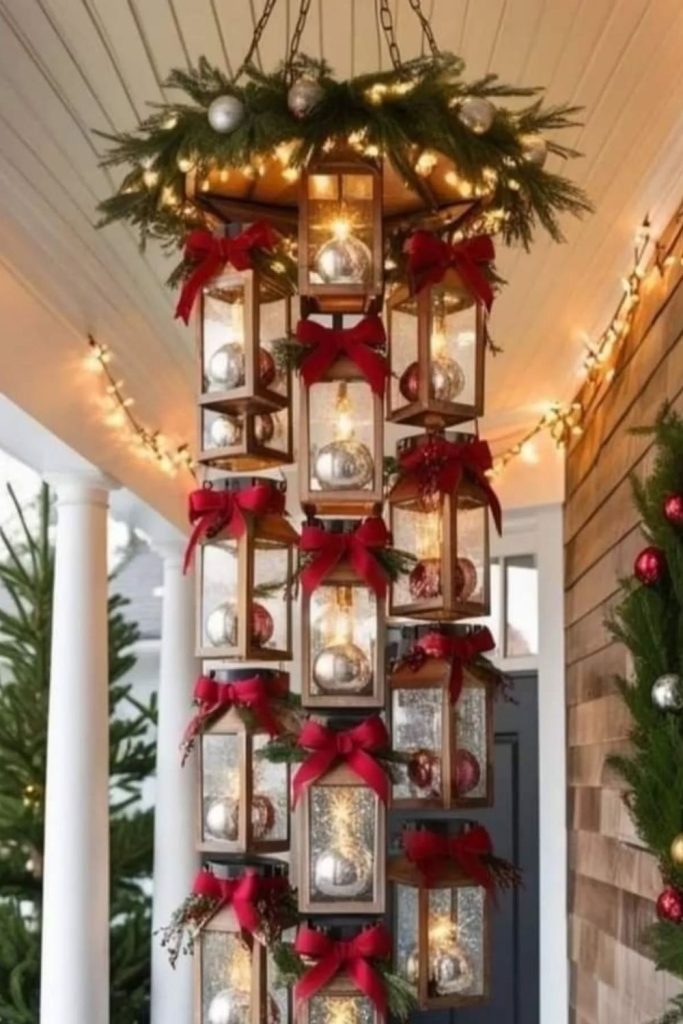This vintage sleigh setup steals the show! A weathered red sleigh sits proudly on the porch, filled with pine branches, fairy lights, and a cozy blanket. Flanking it are lanterns with glowing candles, creating a nostalgic holiday vibe. The sustainable use of upcycled decor makes this eco-friendly and charming. I love how it evokes childhood Christmas memories. Want to recreate this? Hunt for vintage finds at flea markets! Share your favorite retro decor piece below and pin this for your outdoor Christmas decor inspiration. Let’s make your porch magical!