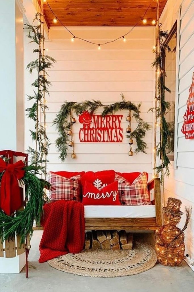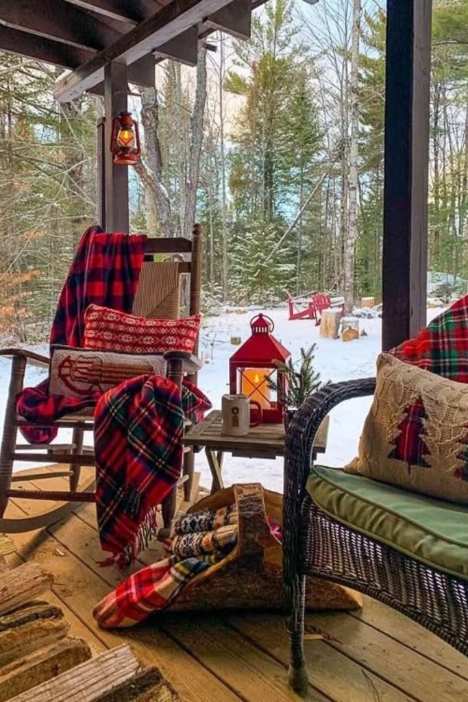 This porch is a cozy haven! A wooden rocker with a red plaid blanket sits beside a potted pine, while a lush garland with fairy lights wraps the railing. The warm, rustic vibe feels perfect for holiday sipping by the firepit. I’m obsessed with how plaid adds instant warmth—try mixing patterns for fun! What’s your cozy decor must-have? Save this for your Christmas decor ideas outdoor and share your porch setup ideas below. Let’s create a holiday retreat!