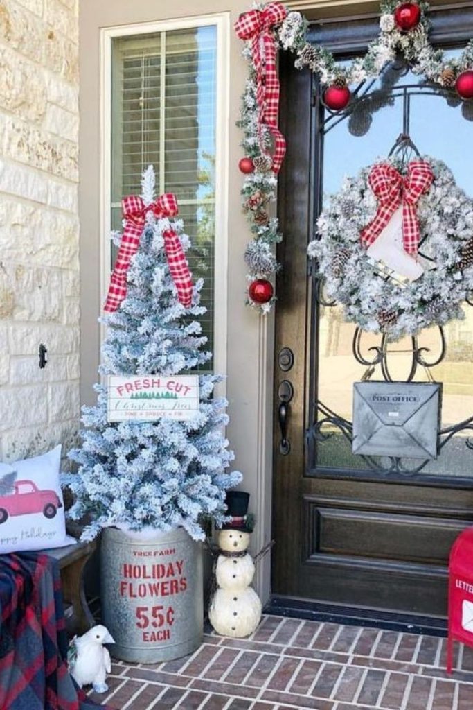 This farmhouse-style porch is holiday perfection! A galvanized bucket filled with fresh pine branches sits beside a wooden bench draped with a red plaid throw. A simple wreath with a burlap bow adds rustic charm, while fairy lights create a cozy glow. The sustainable mix of natural and upcycled pieces feels so authentic. I’m all about that warm, welcoming vibe for holiday guests. Try repurposing old buckets for decor! What’s your farmhouse decor trick? Save this for your Christmas decor ideas outdoor and drop your thoughts below!